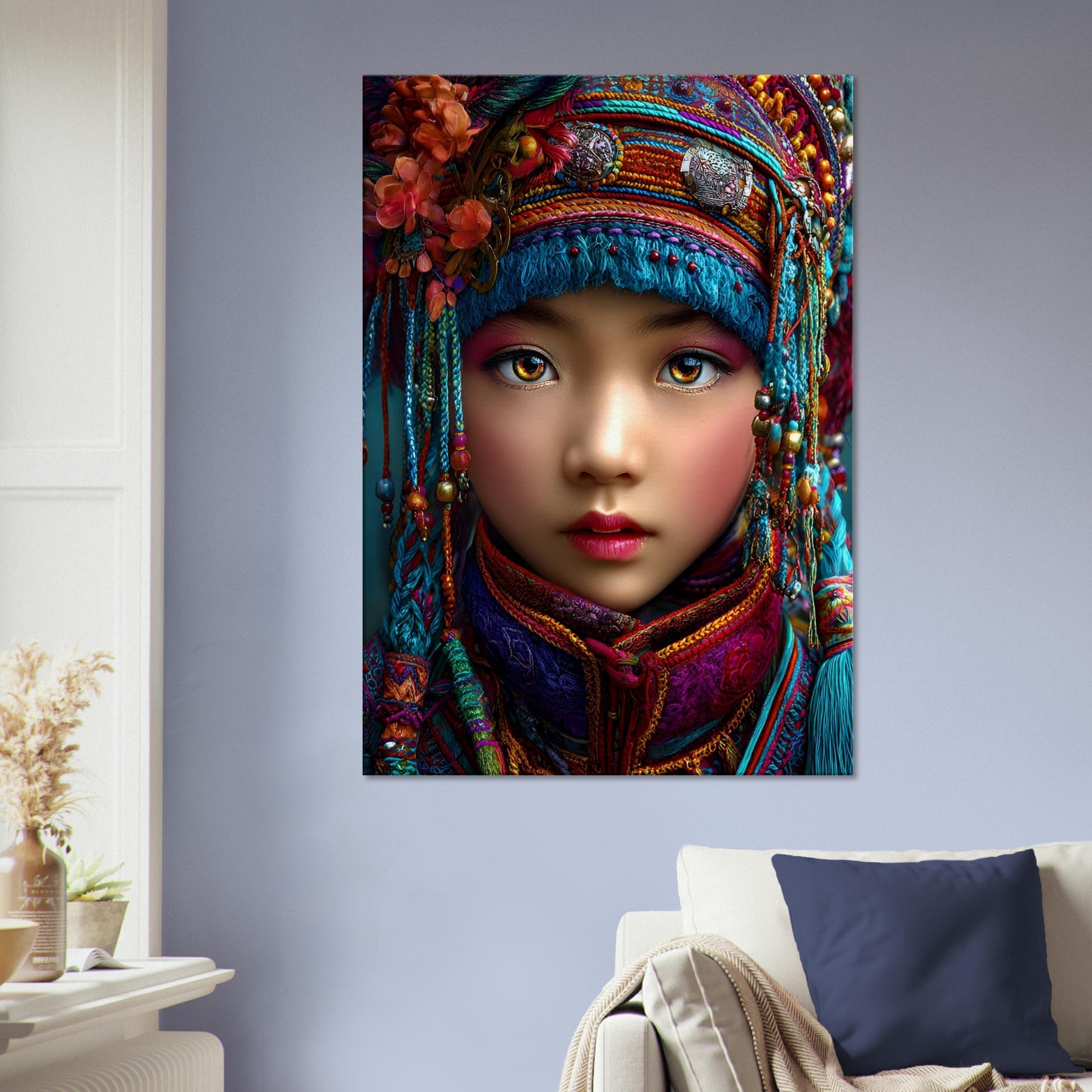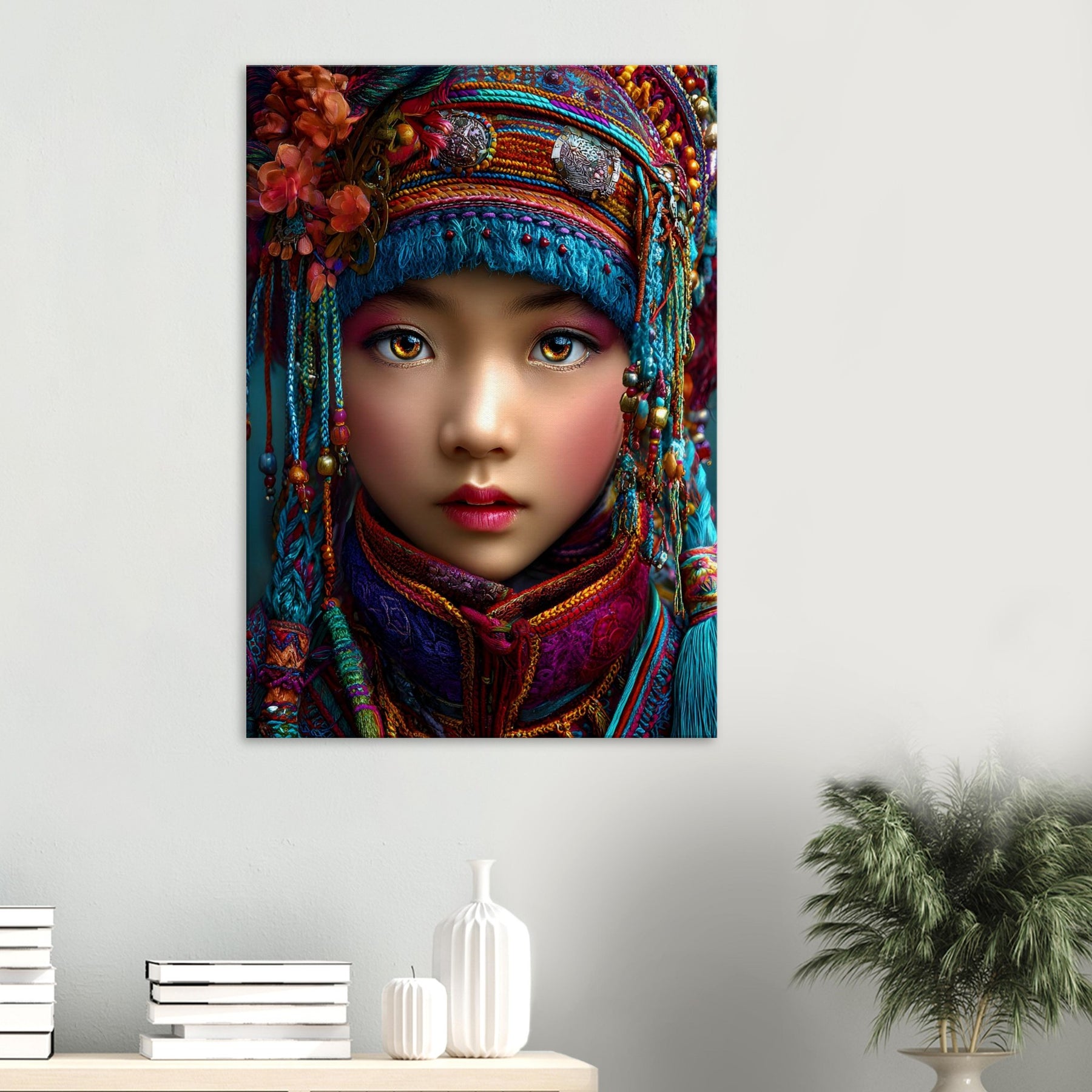 Celebrate heritage and beauty with Cultural Radiance, a stunning canvas wall art piece featuring a woman adorned with vibrant traditional headgear and intricate jewelry. Rich colors and fine details come together to honor cultural identity while expressing elegance, strength, and timeless beauty.