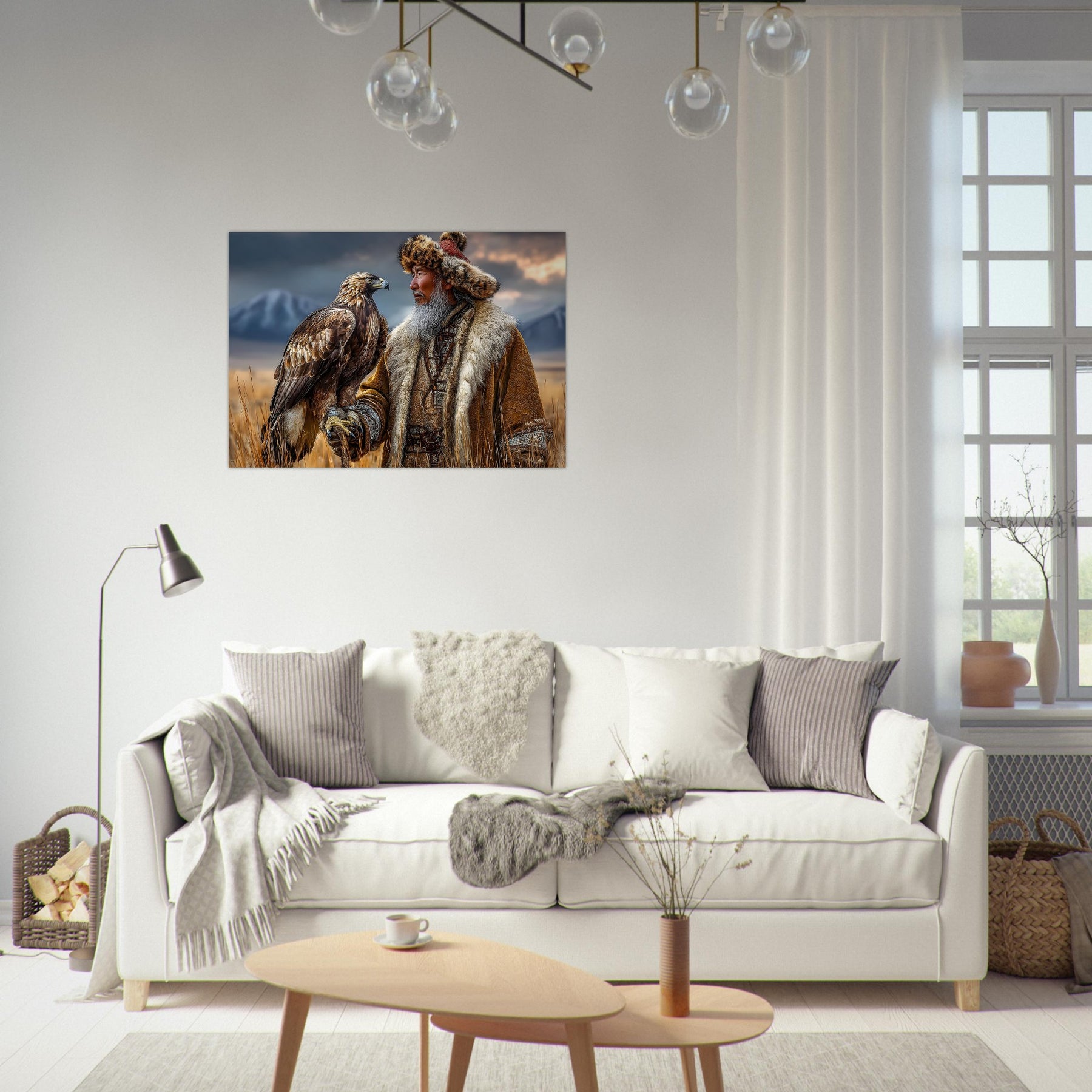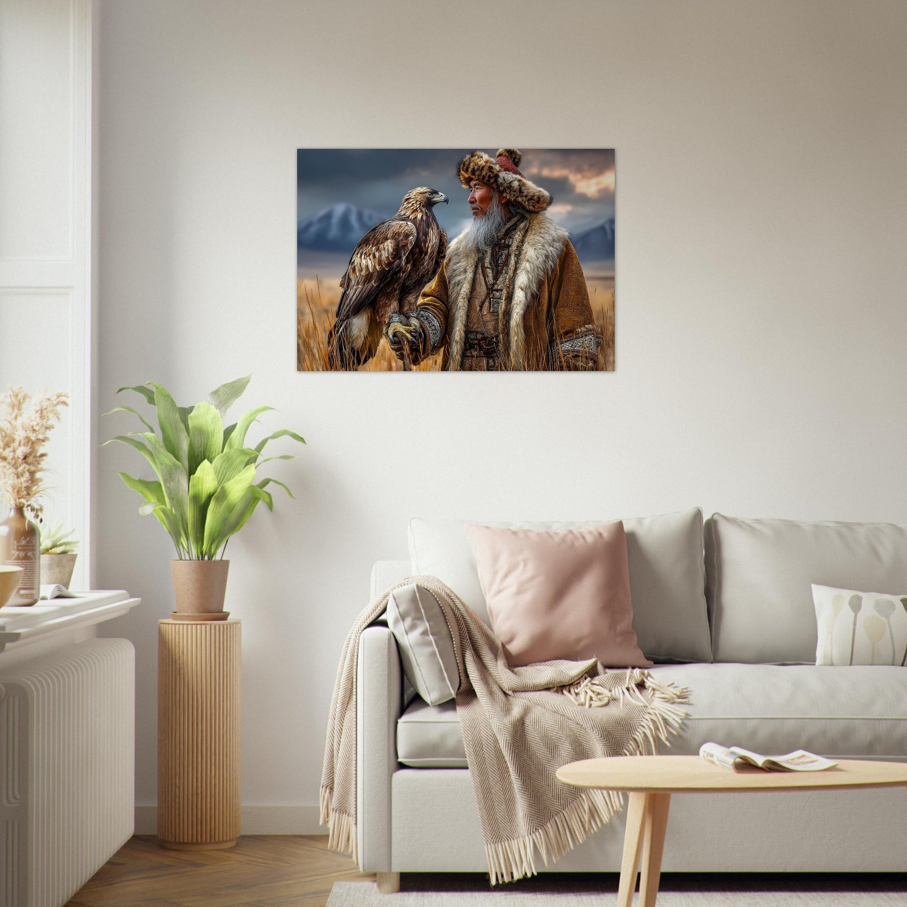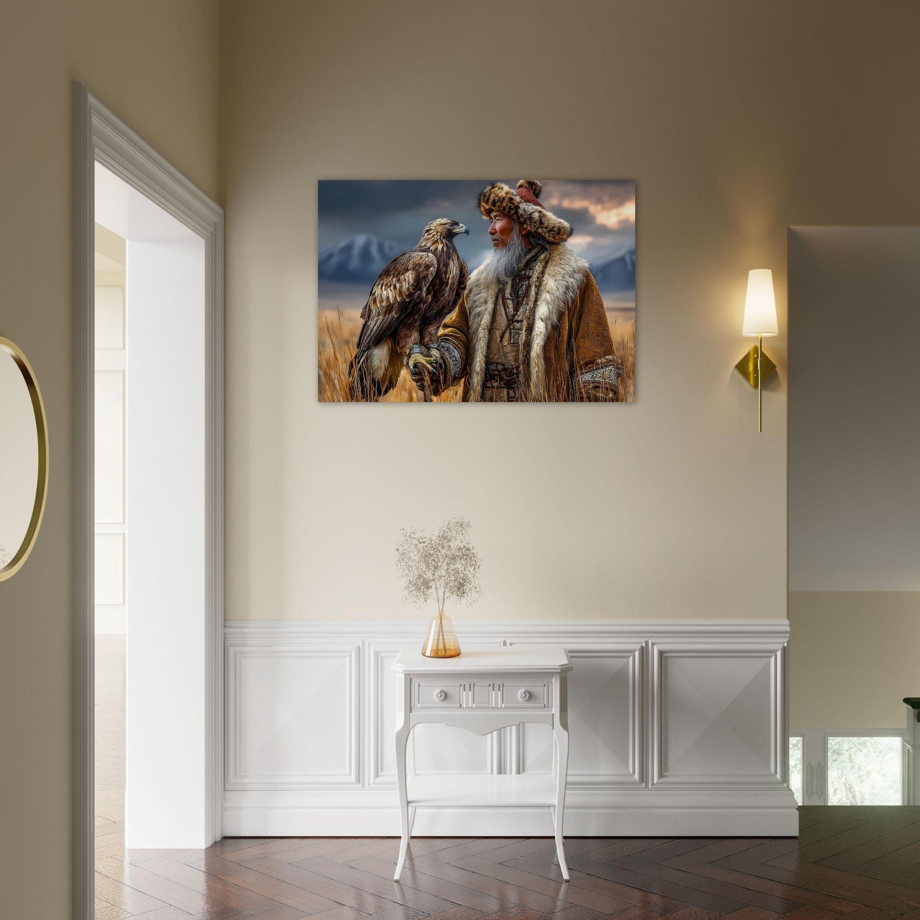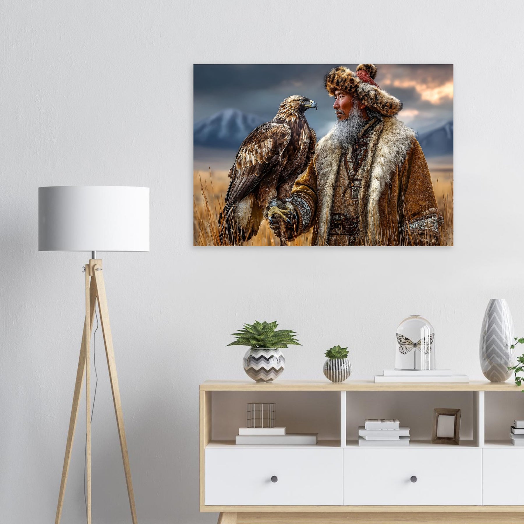 Transform your space with Eagle Guardian of the Mountains, a lightweight foam wall art piece that blends cultural storytelling with striking natural scenery. Featuring a dignified man in traditional dress with an eagle resting on his arm, this vivid artwork sits before a stunning mountain landscape that instantly captures attention.