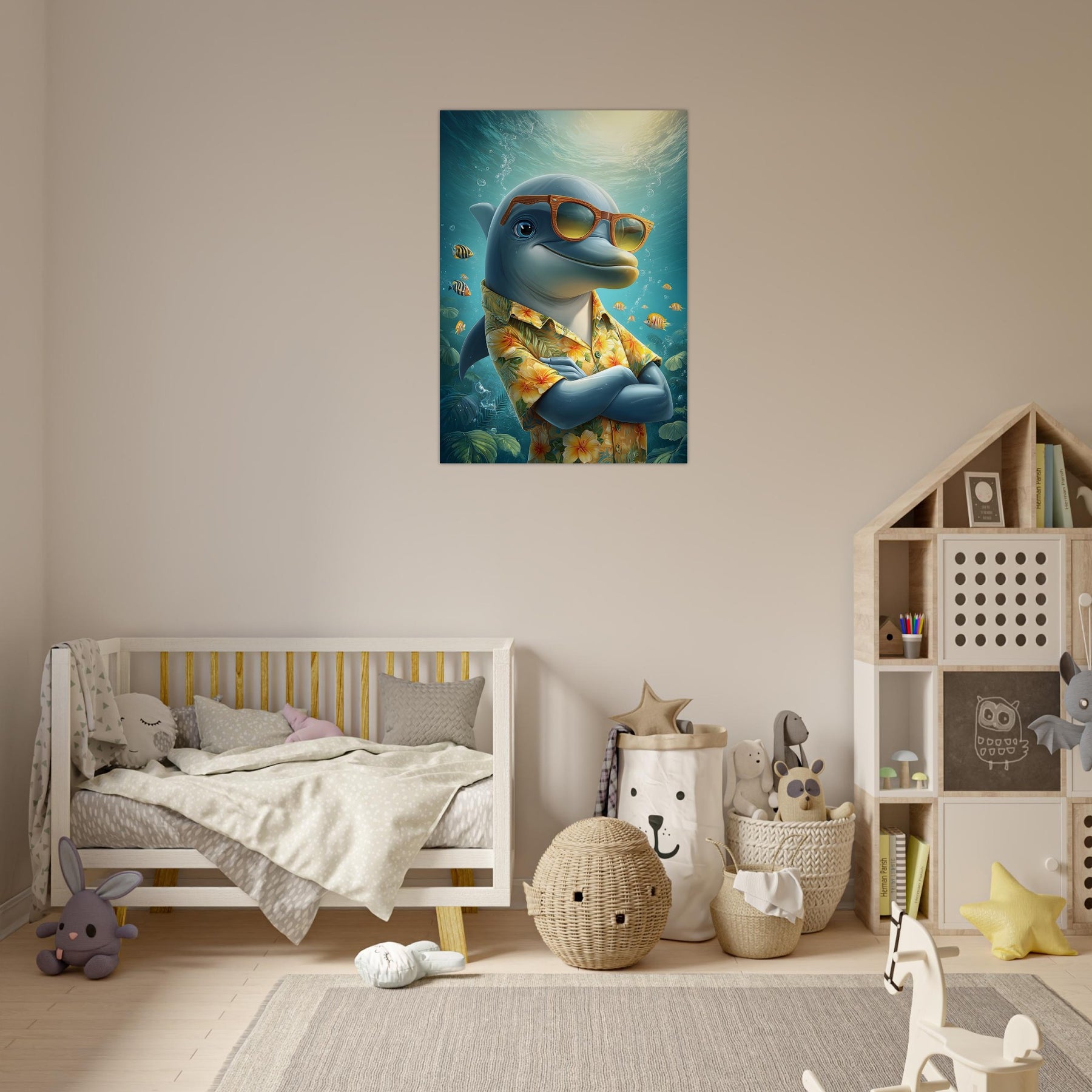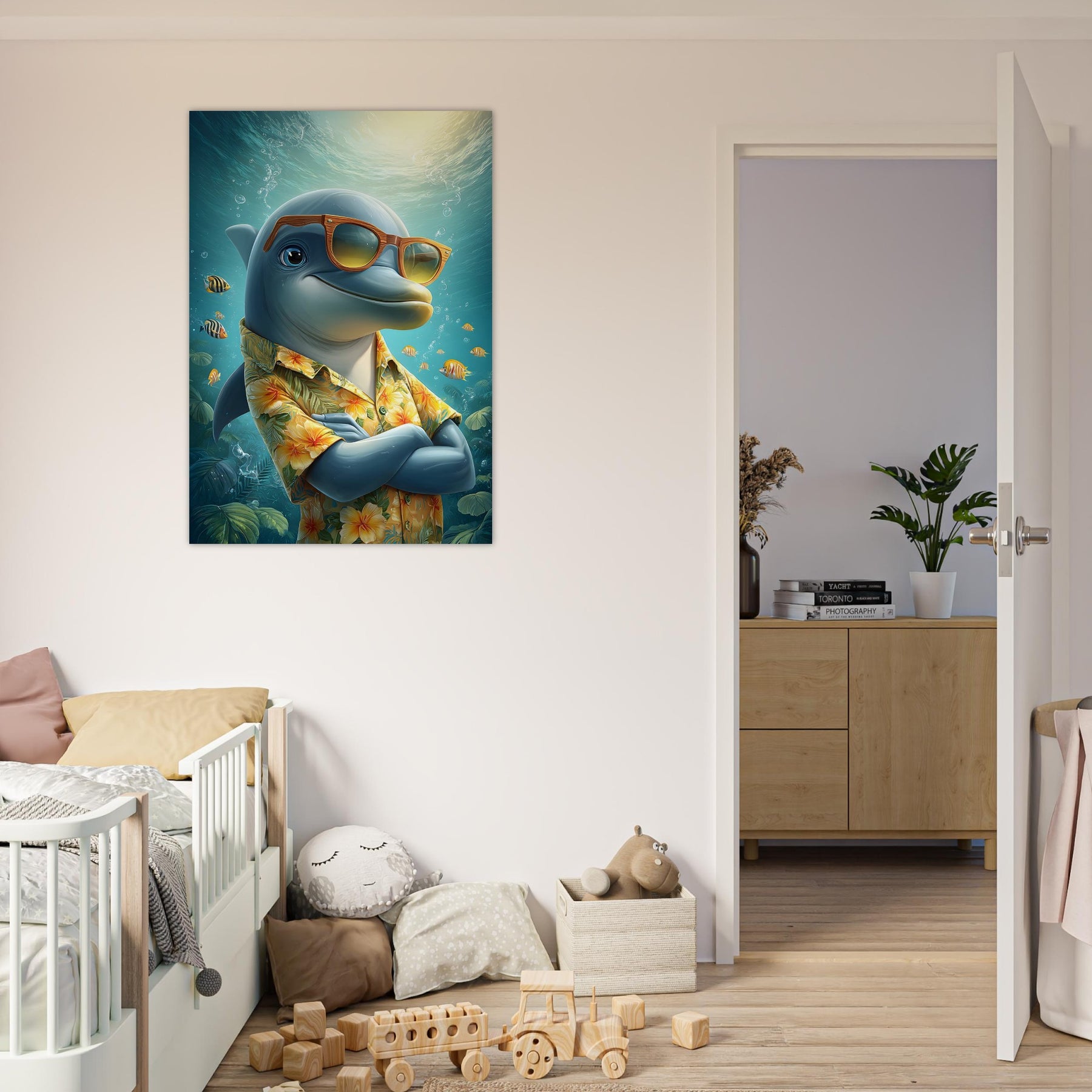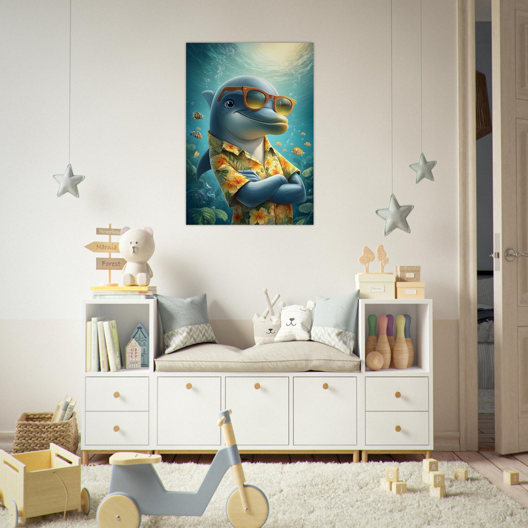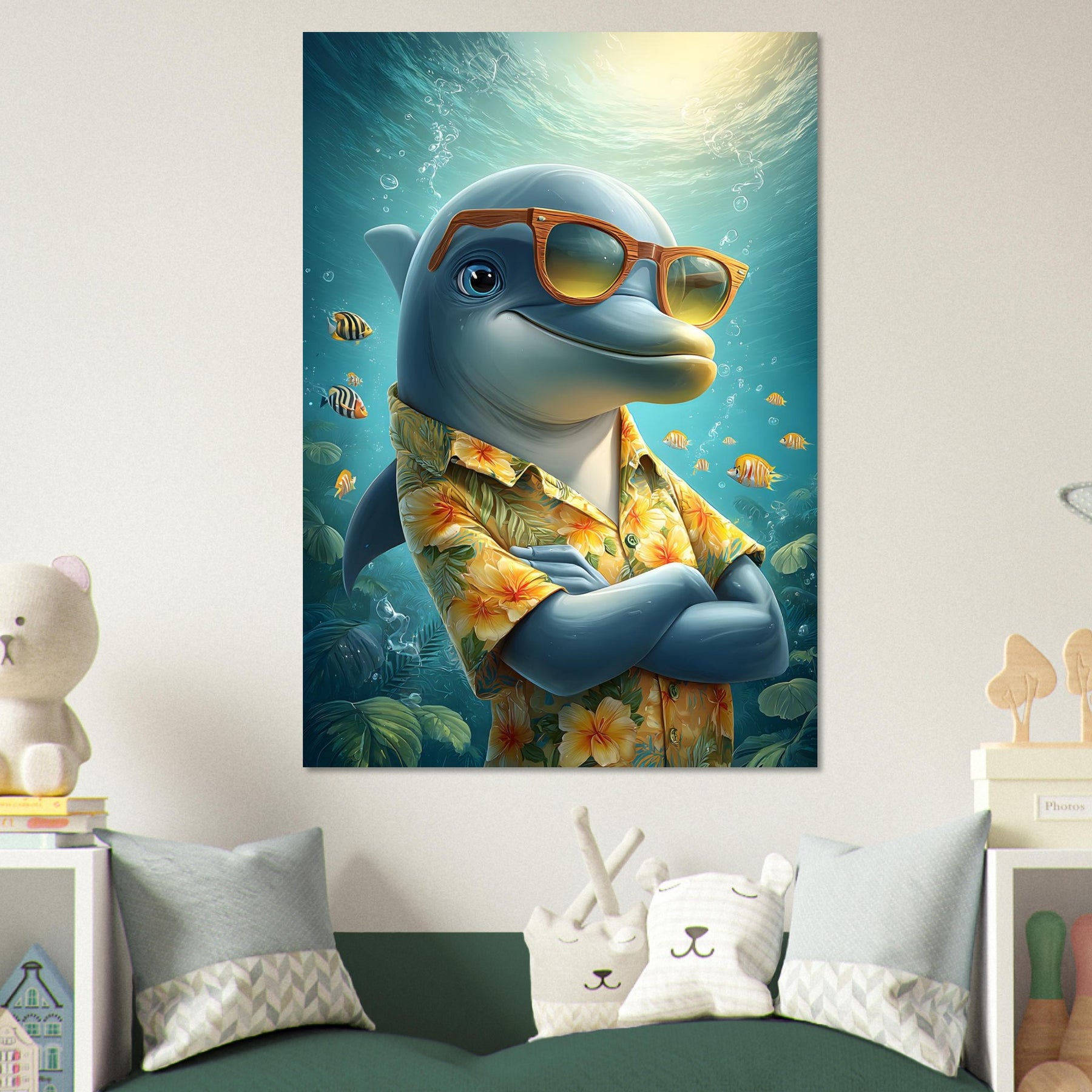 Make a splash of joy in your child’s room with our Cool Dolphin Adventure Aluminum Wall Art. This playful illustration features a charming dolphin rocking stylish sunglasses and a vibrant Hawaiian shirt, striking a confident pose underwater among colorful tropical fish and golden rays of sunlight. Bursting with fun, color, and adventure, this artwork captures the carefree spirit of the ocean and brings cheerful energy to any kid’s space.