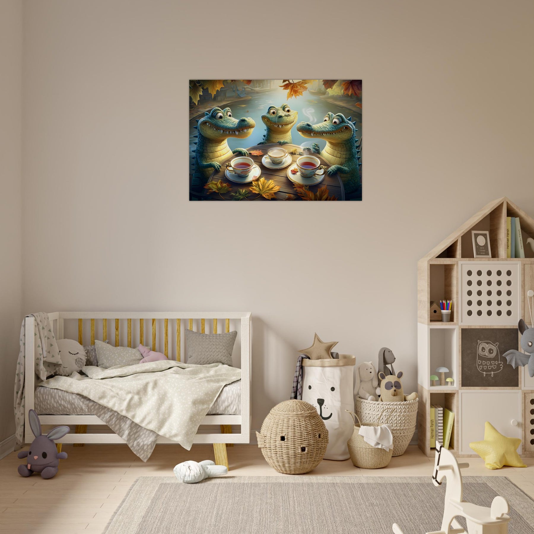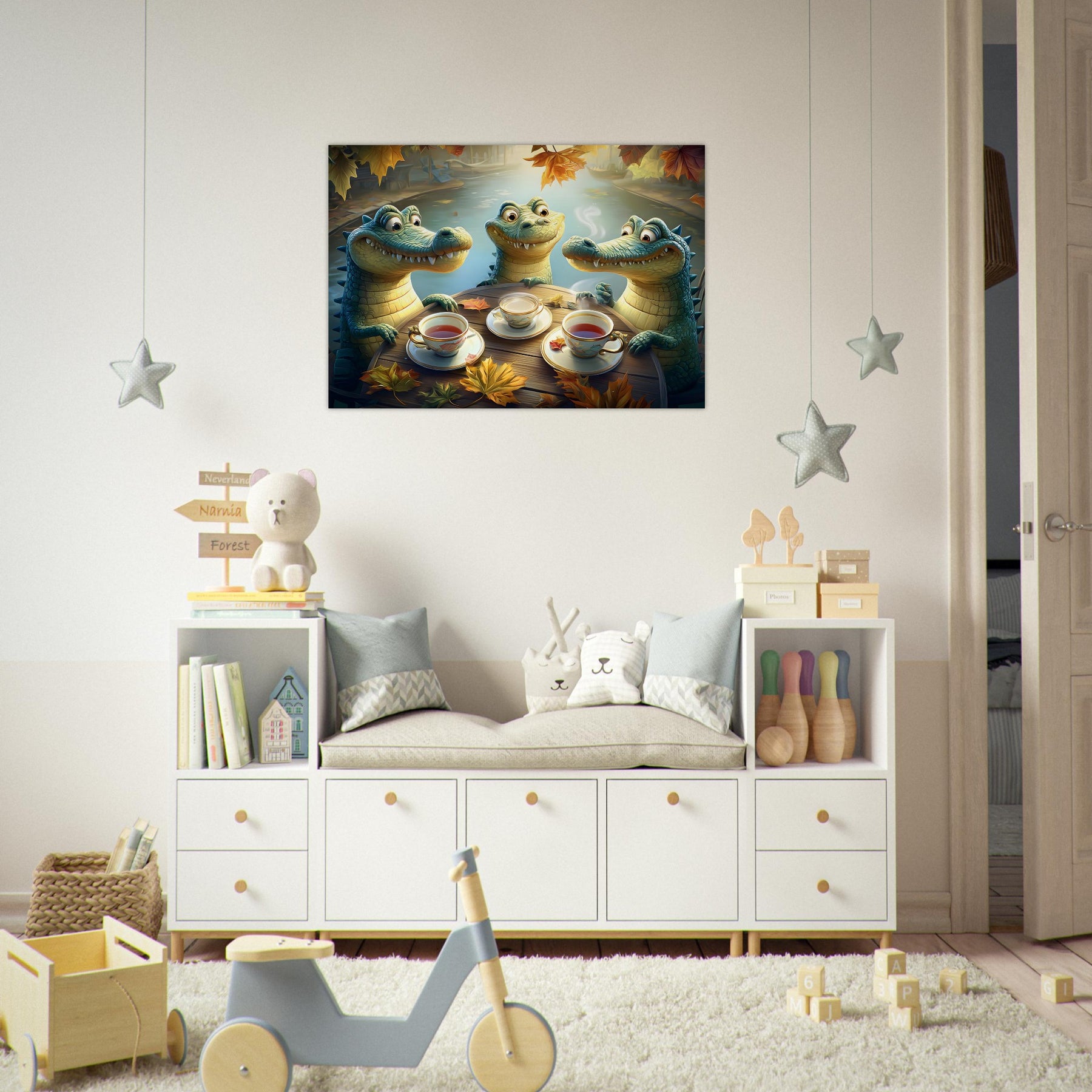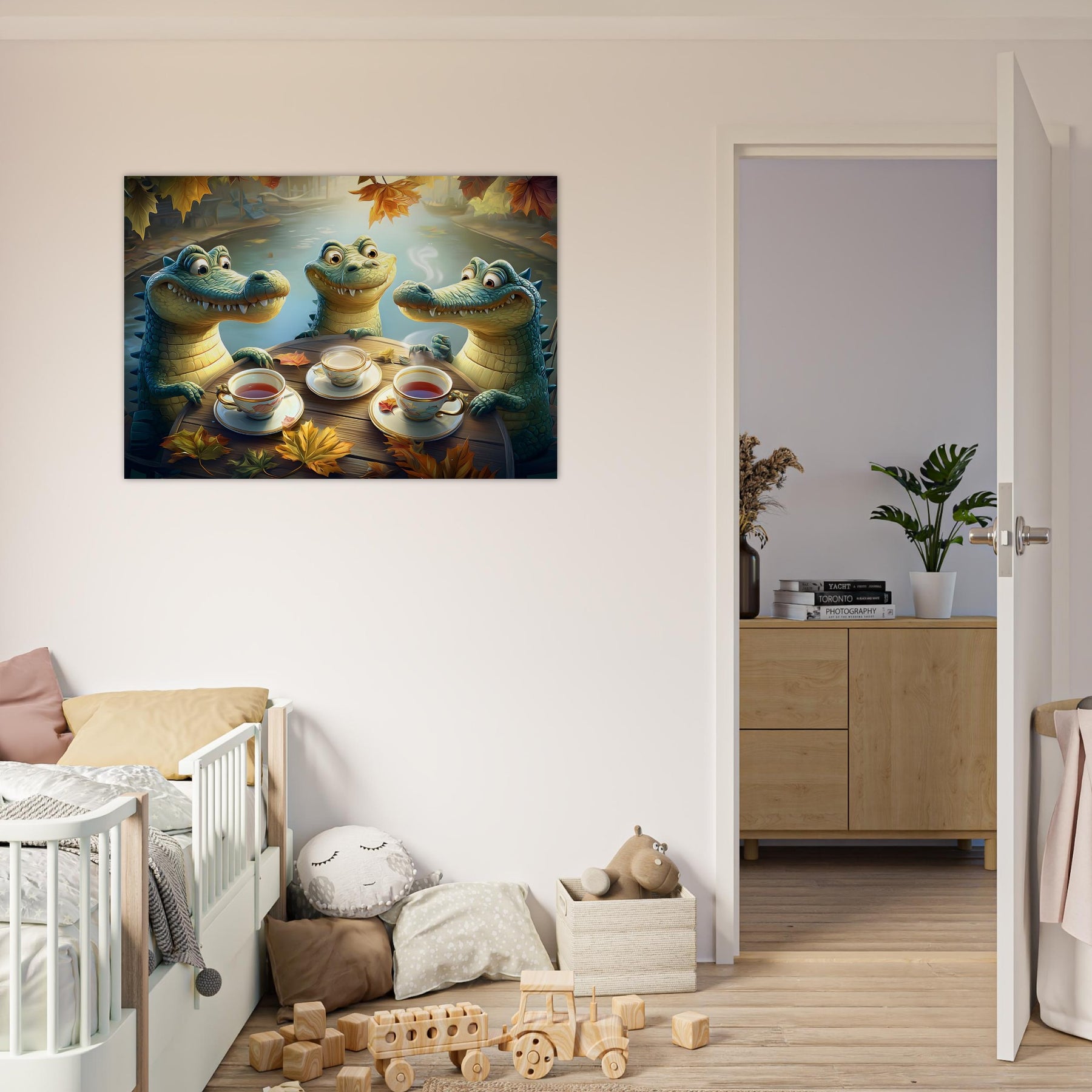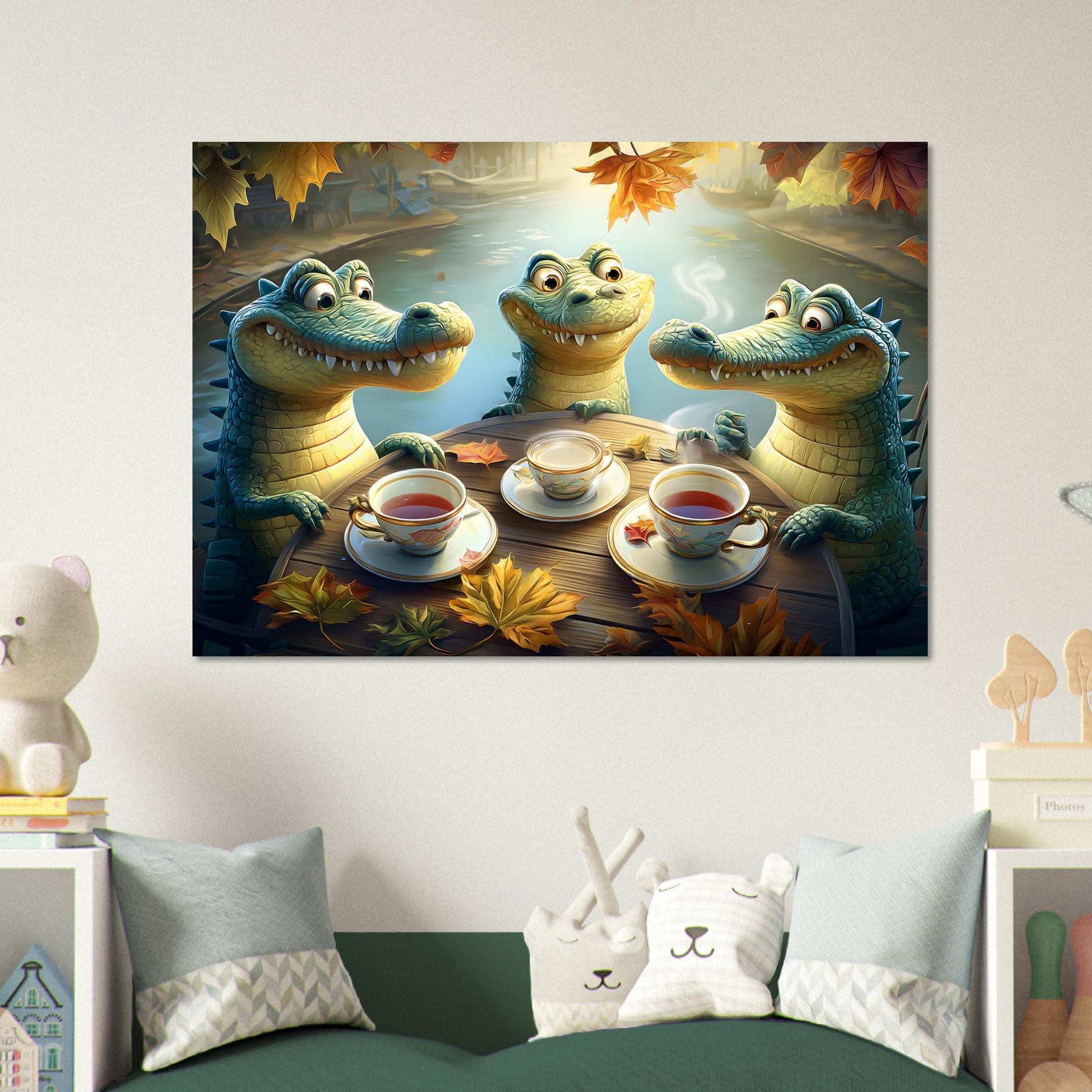 Bring imagination to life with the Whimsical Riverside Tea Party Aluminum Wall Art, a delightful addition to your child’s room. This charming illustration features three playful cartoon alligators enjoying a joyful tea party by a tranquil riverside, surrounded by vibrant autumn leaves and warm, golden tones. The scene captures the perfect blend of friendship, laughter, and nature’s beauty, sparking creativity and smiles every time you look at it.