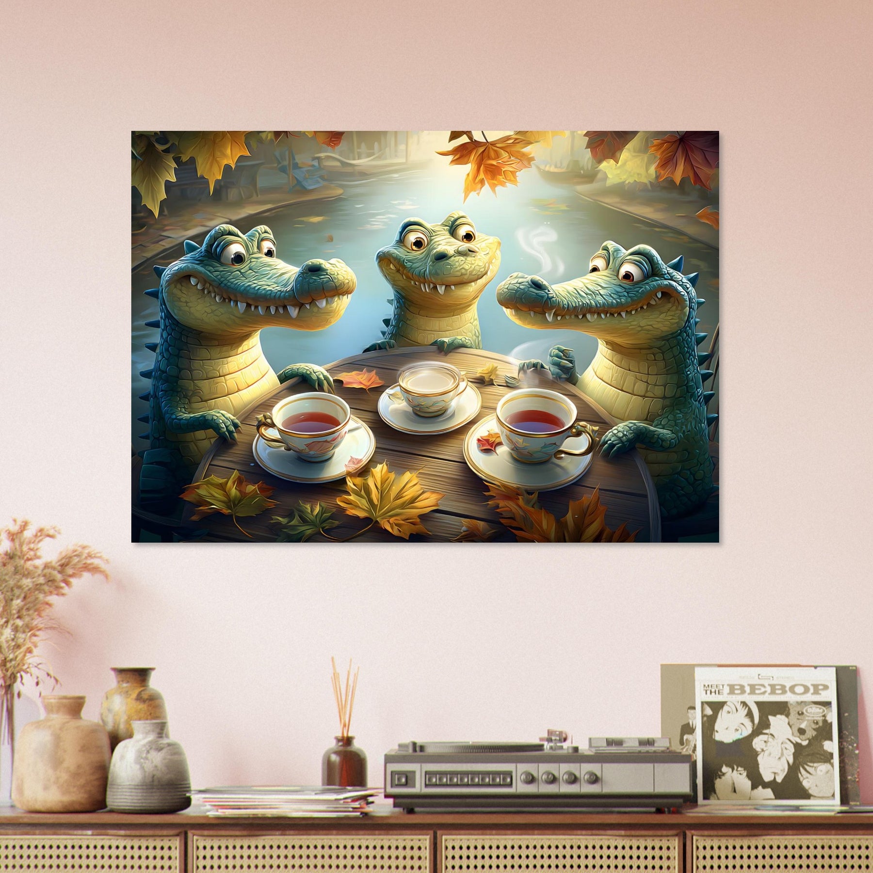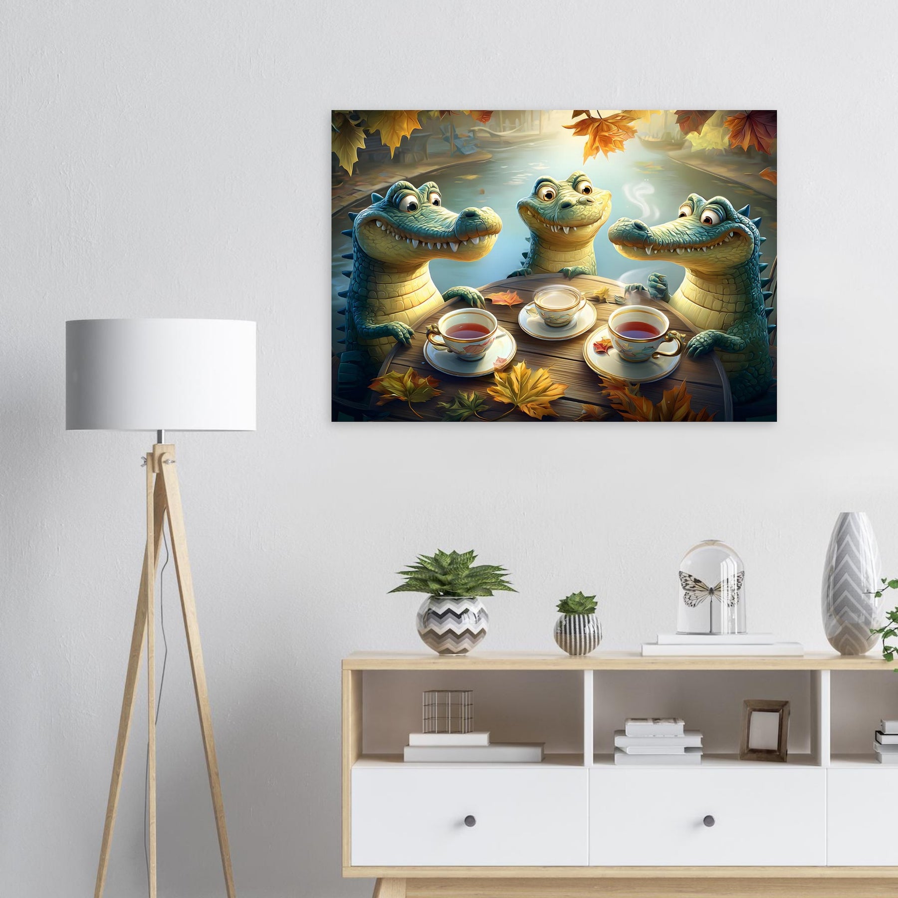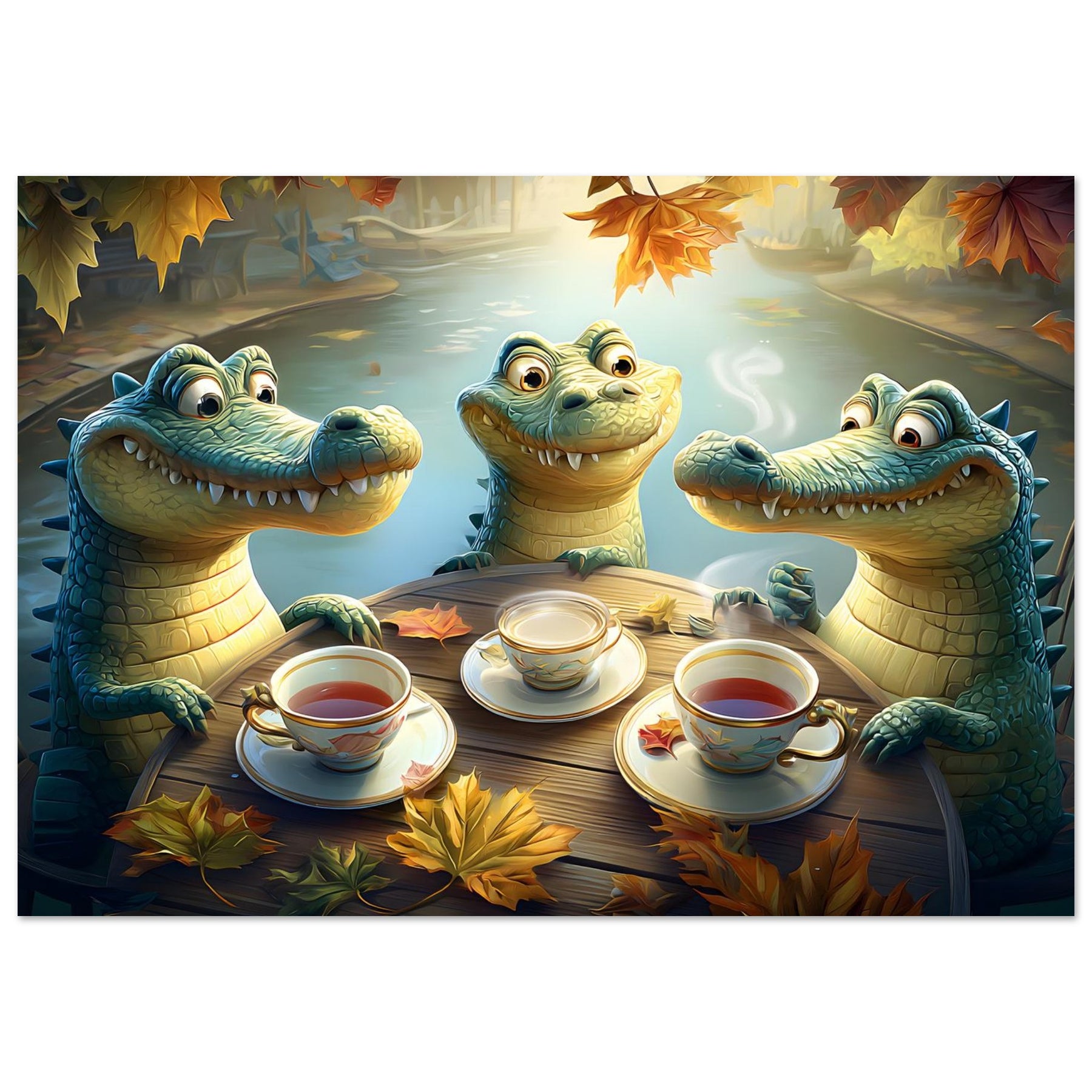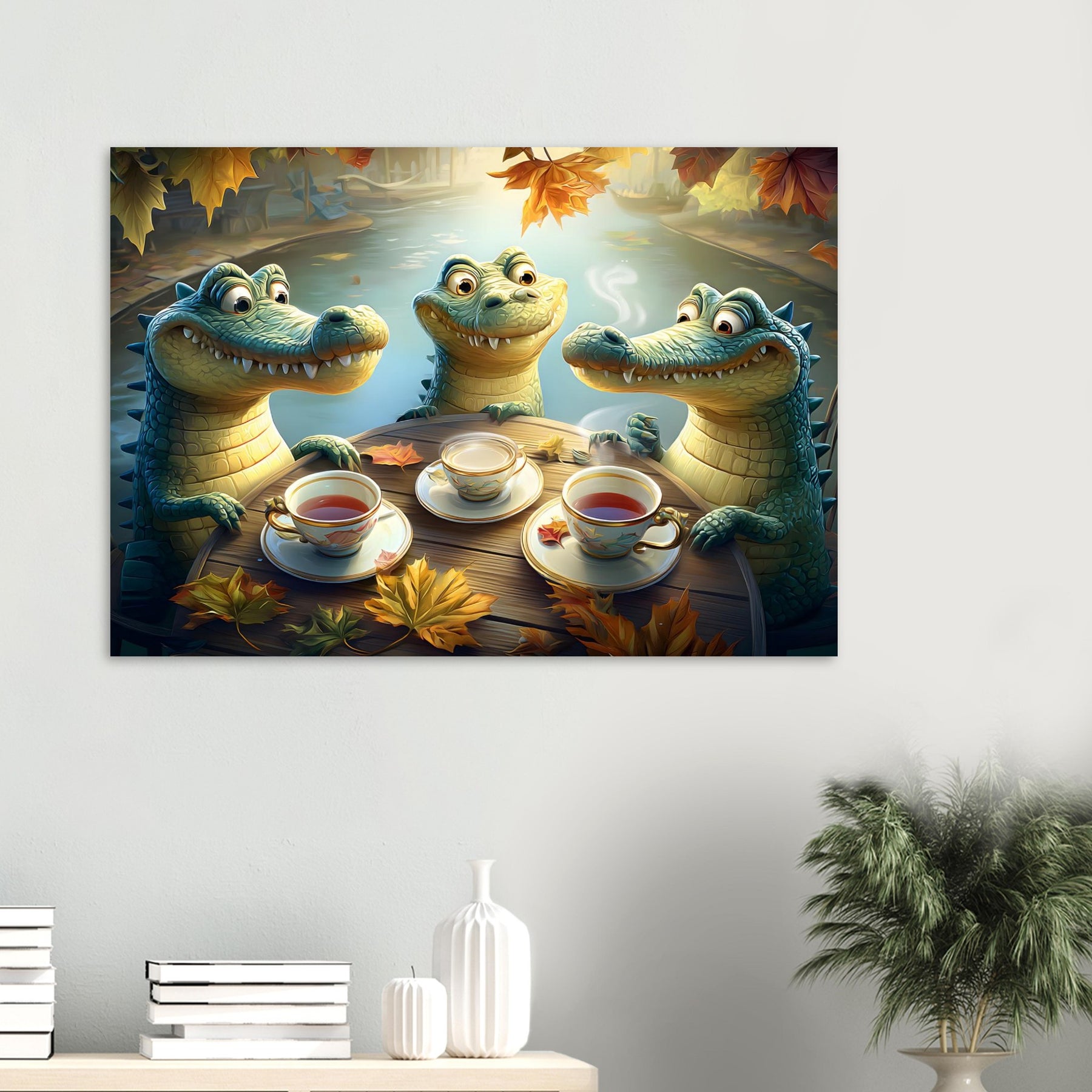 Bring imagination to life with the Whimsical Riverside Tea Party Aluminum Wall Art, a delightful addition to your child’s room. This charming illustration features three playful cartoon alligators enjoying a joyful tea party by a tranquil riverside, surrounded by vibrant autumn leaves and warm, golden tones. The scene captures the perfect blend of friendship, laughter, and nature’s beauty, sparking creativity and smiles every time you look at it.