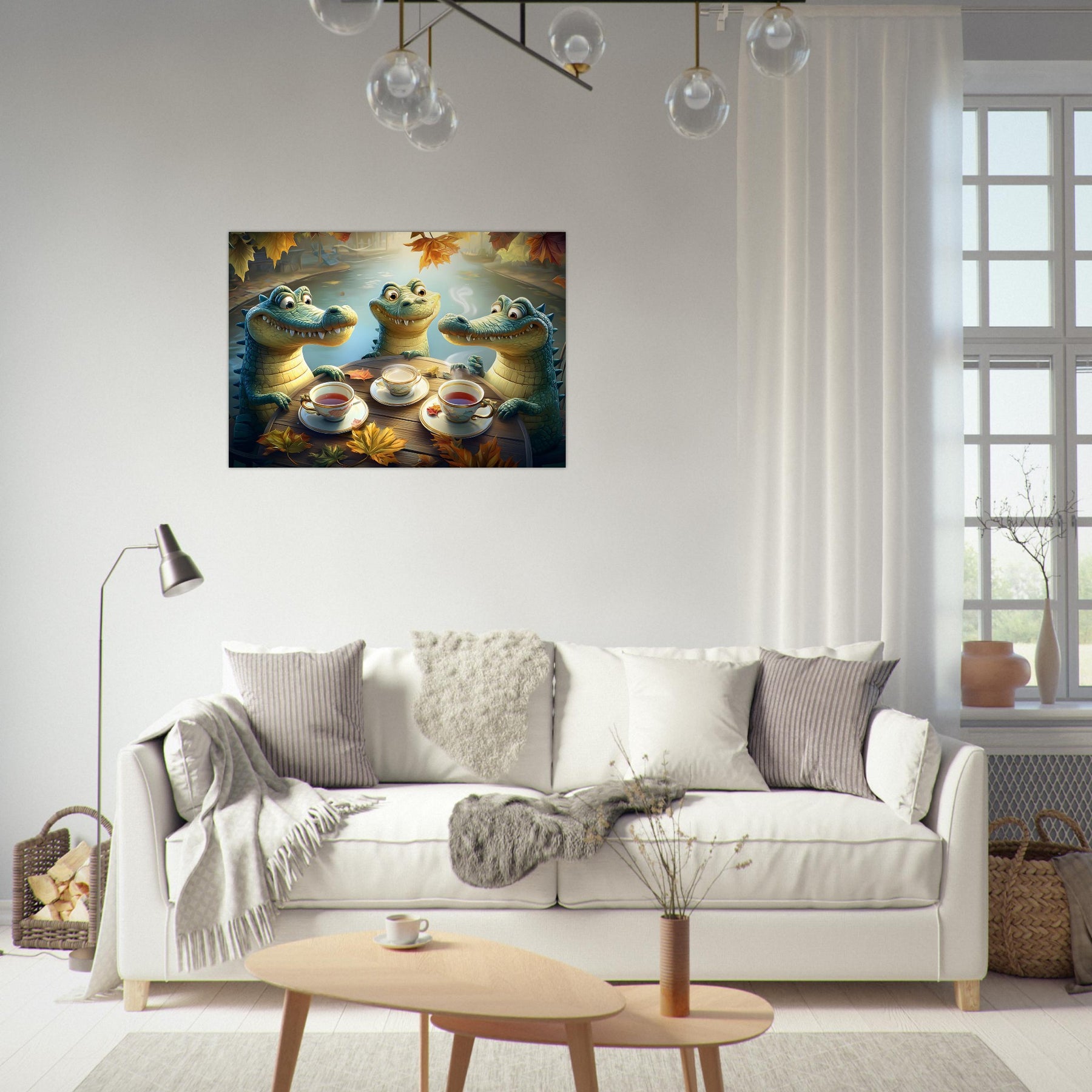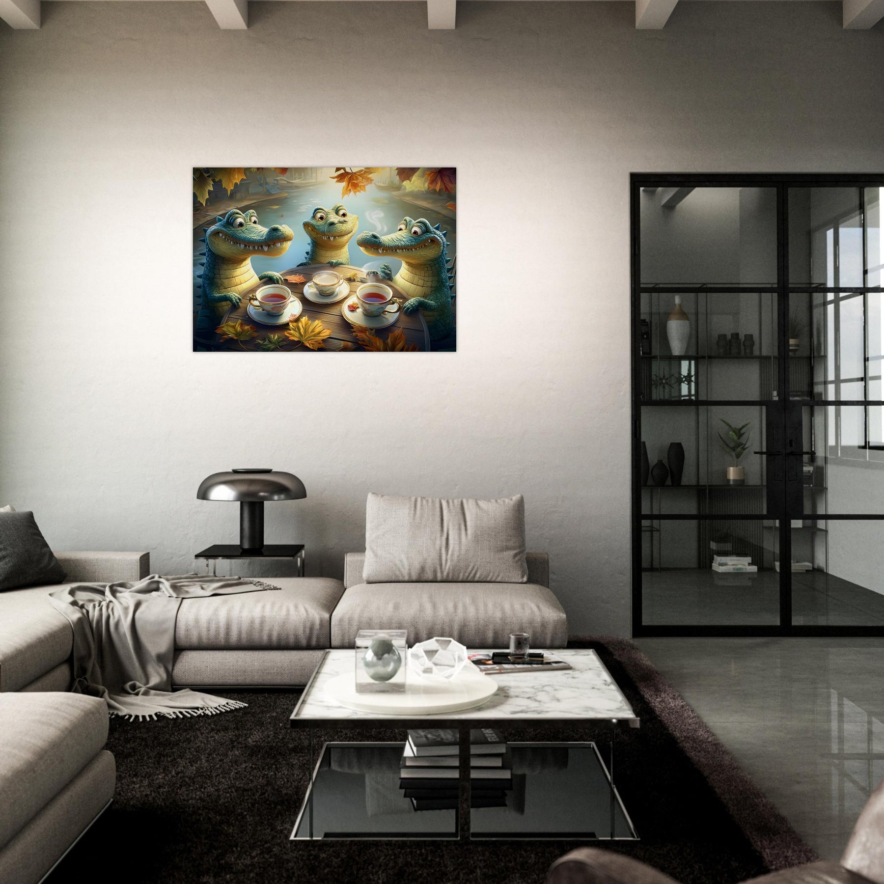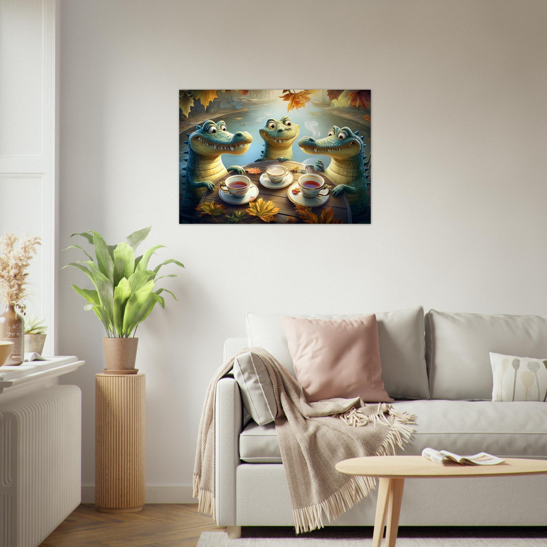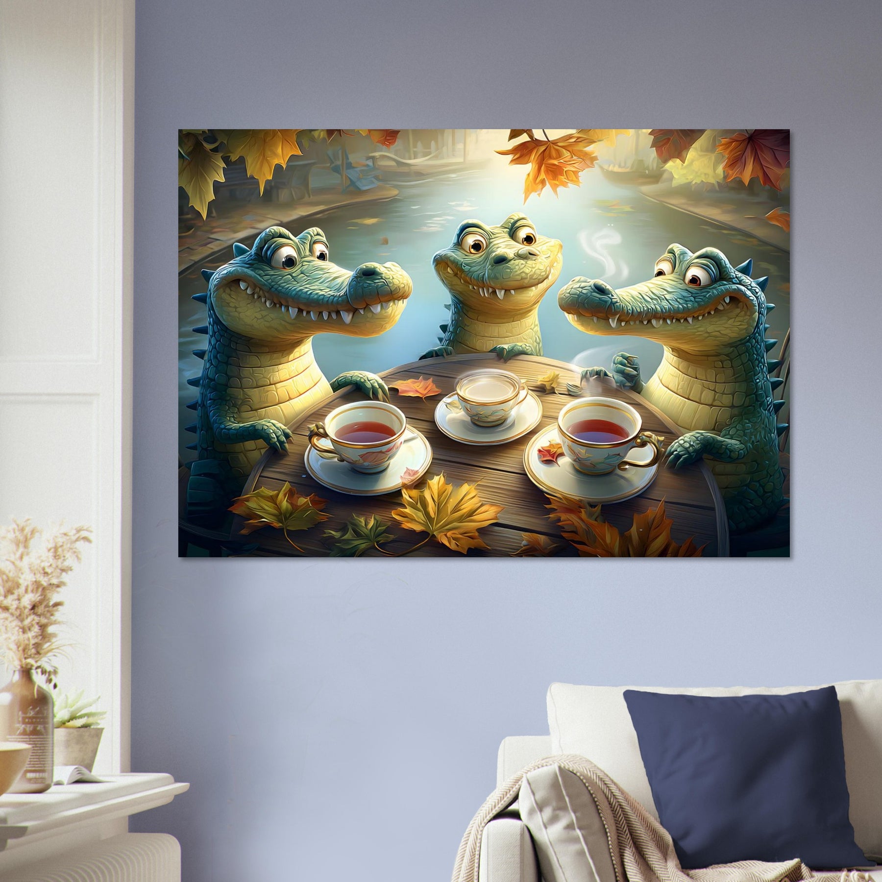 Bring imagination to life with the Whimsical Riverside Tea Party Aluminum Wall Art, a delightful addition to your child’s room. This charming illustration features three playful cartoon alligators enjoying a joyful tea party by a tranquil riverside, surrounded by vibrant autumn leaves and warm, golden tones. The scene captures the perfect blend of friendship, laughter, and nature’s beauty, sparking creativity and smiles every time you look at it.