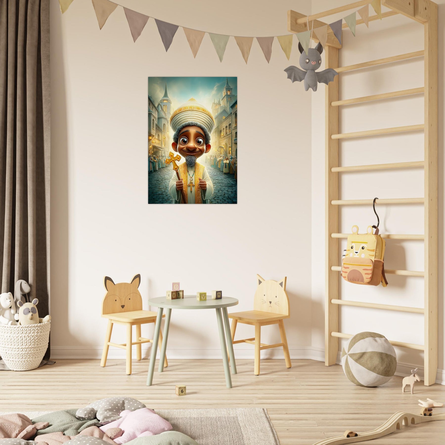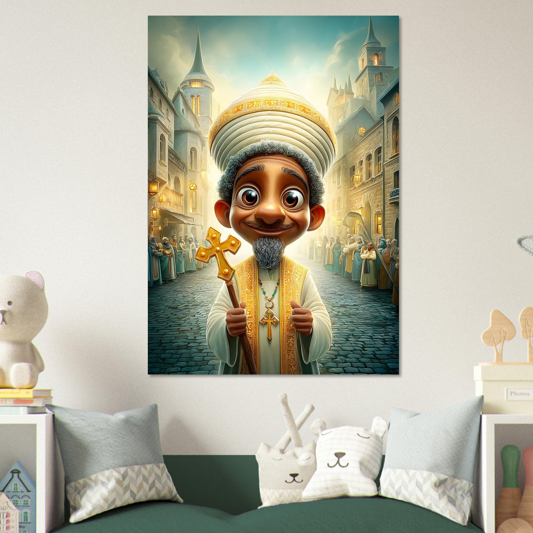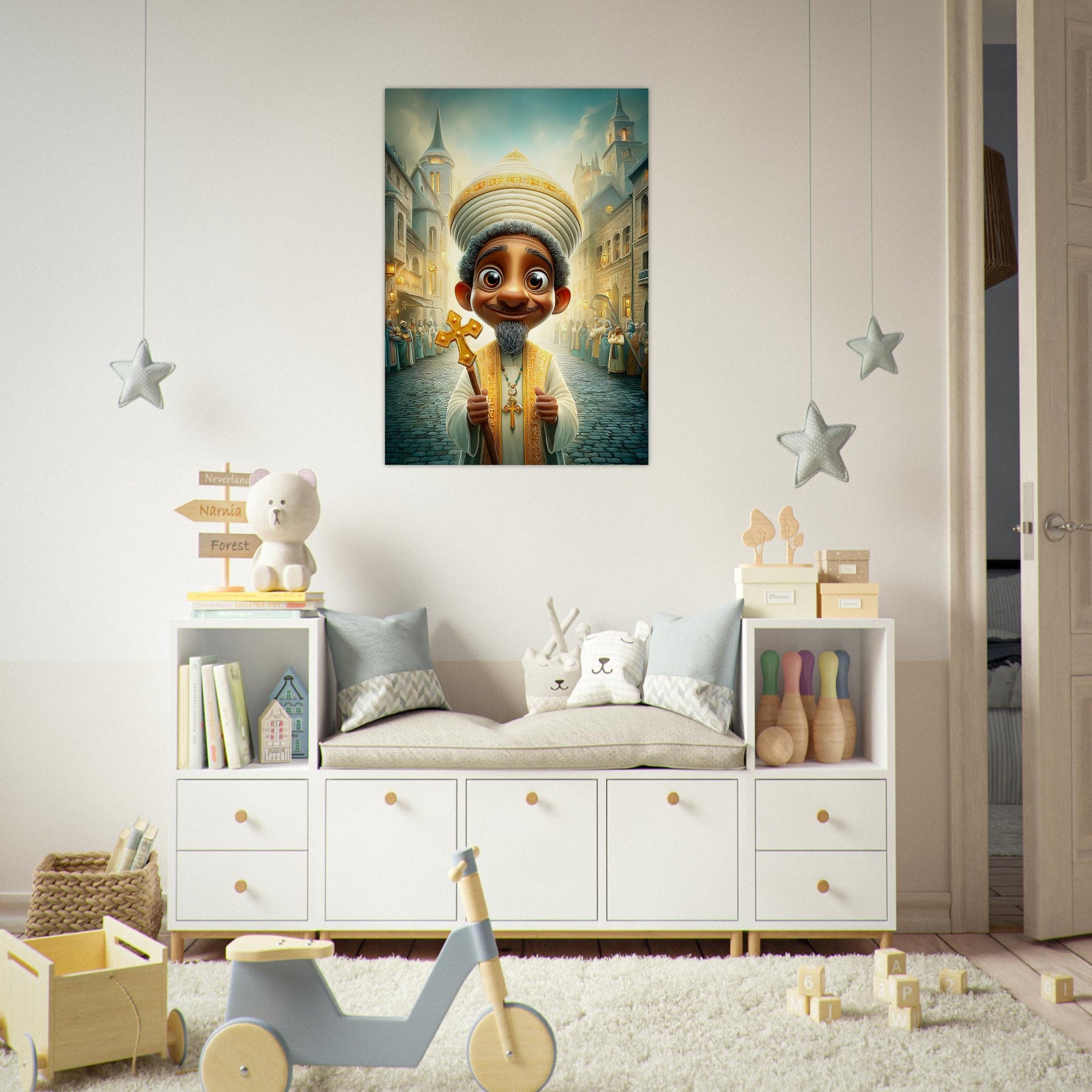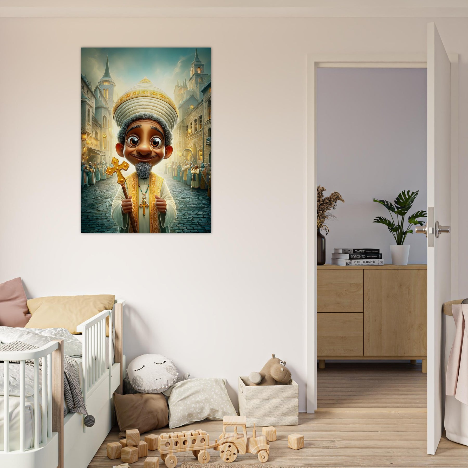 Bring culture, color, and charm to your child’s space with Heritage of Joy, a captivating aluminum wall art illustration featuring a whimsical Ethiopian man dressed in traditional robes. Standing proudly in an enchanting old town filled with intricate architecture and a lively crowd, this vibrant artwork celebrates history, identity, and the beauty of community.