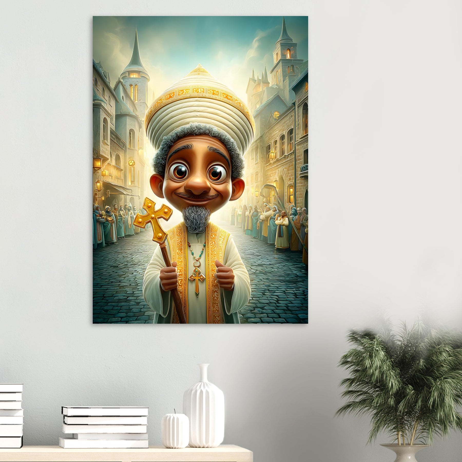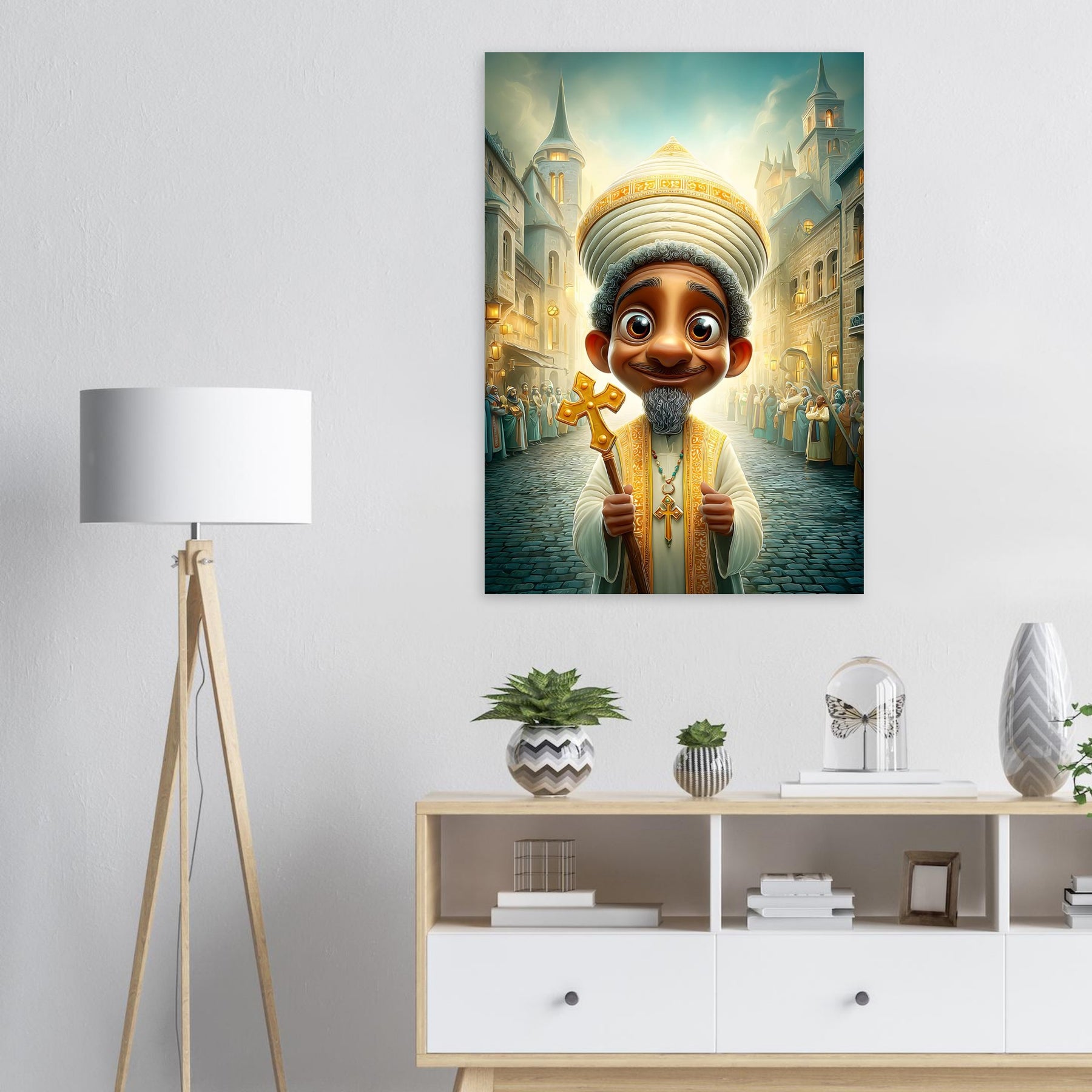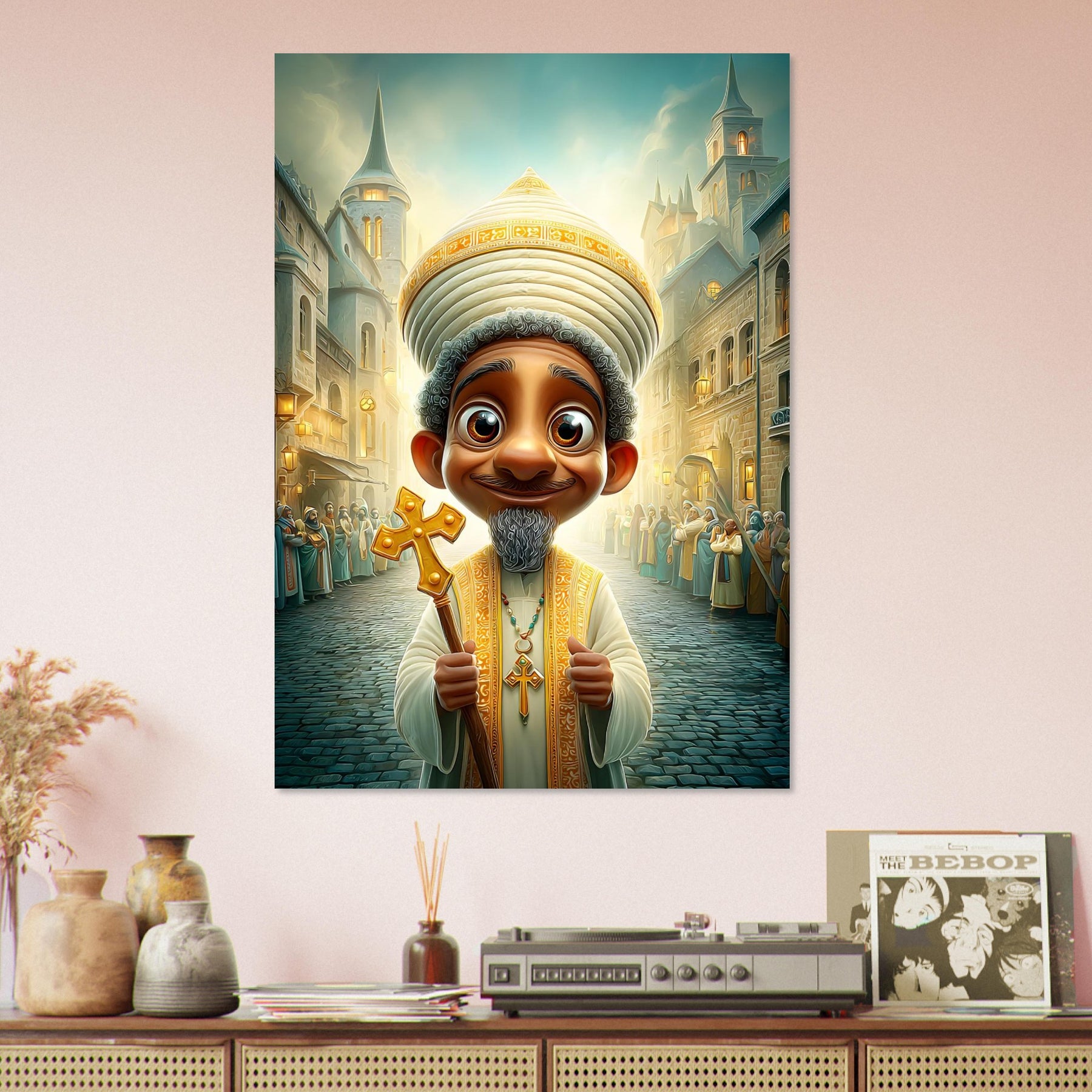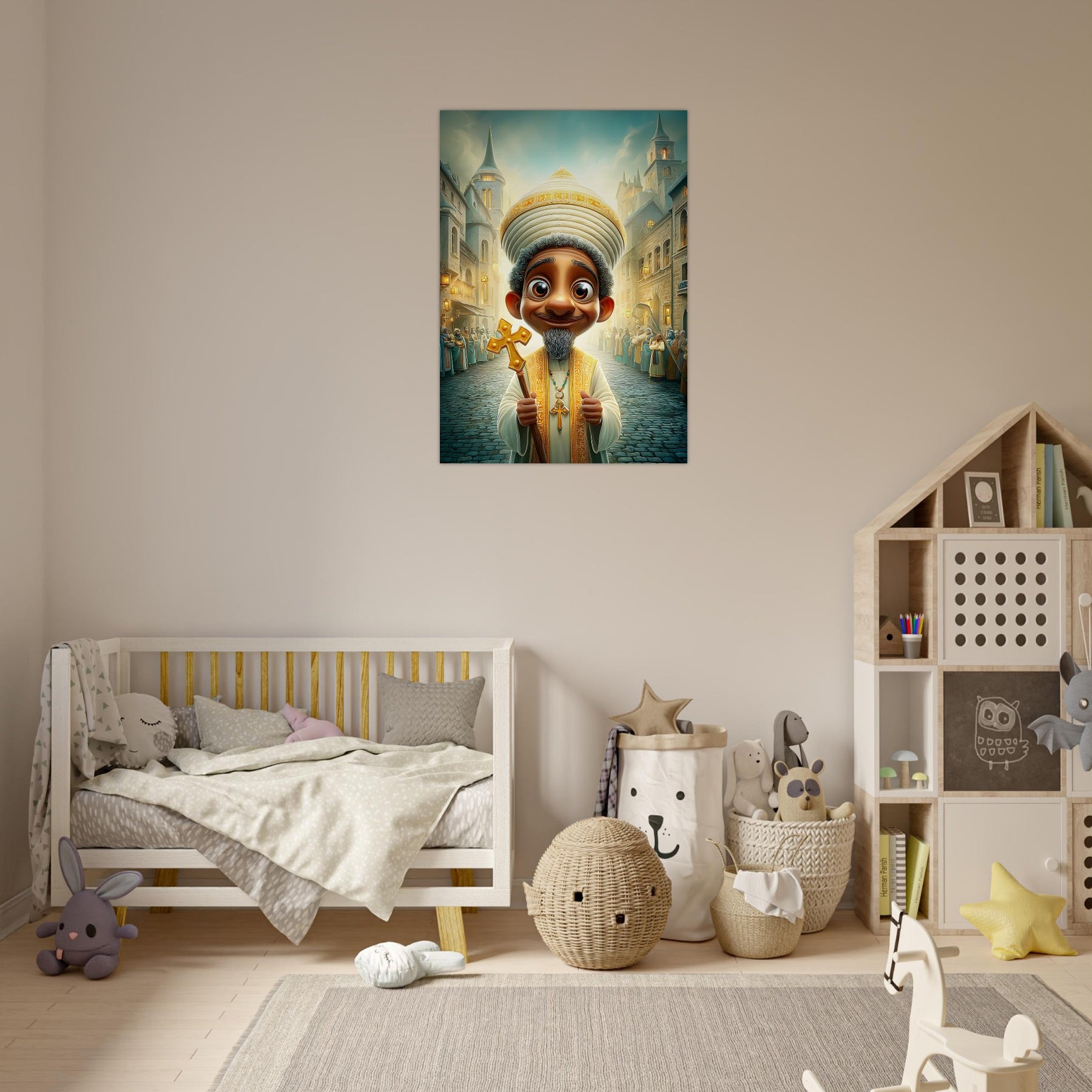Bring culture, color, and charm to your child’s space with Heritage of Joy, a captivating aluminum wall art illustration featuring a whimsical Ethiopian man dressed in traditional robes. Standing proudly in an enchanting old town filled with intricate architecture and a lively crowd, this vibrant artwork celebrates history, identity, and the beauty of community.