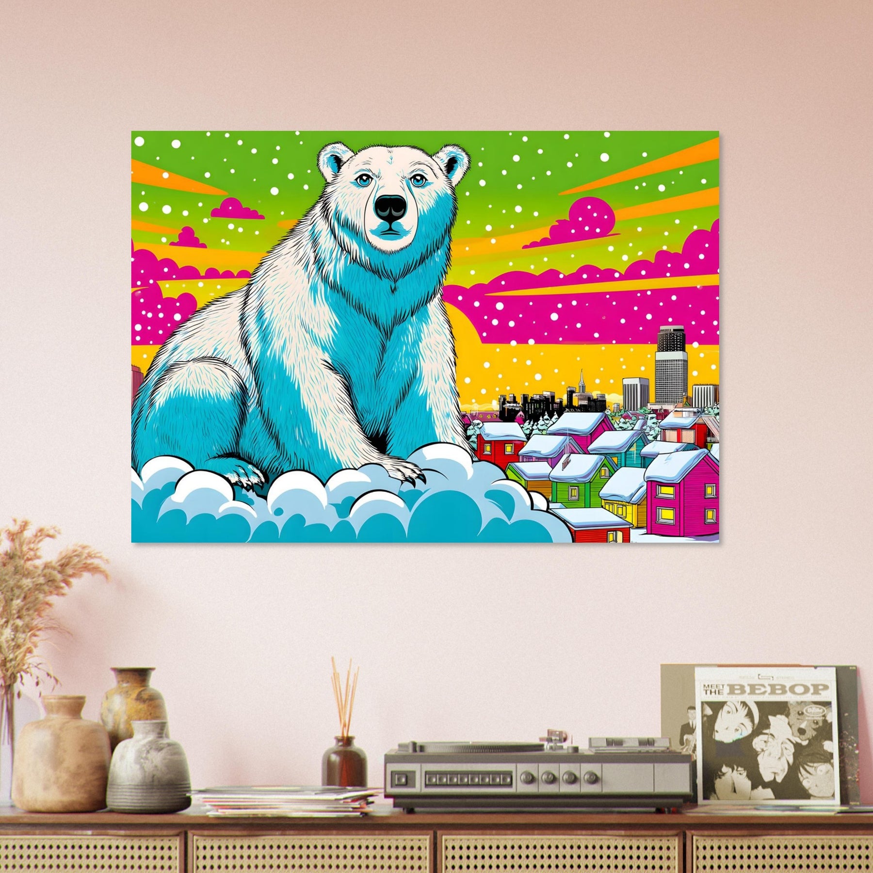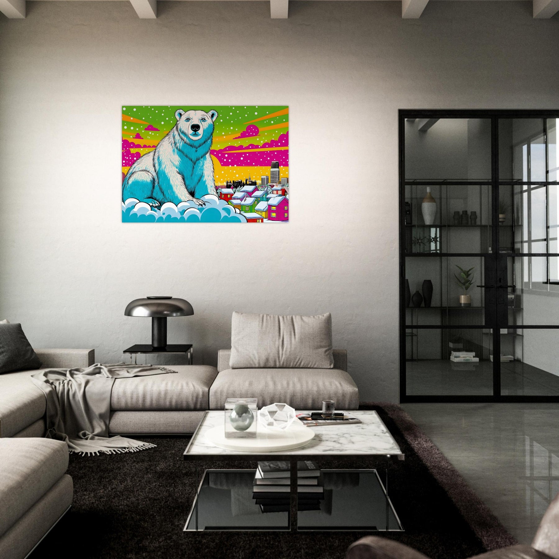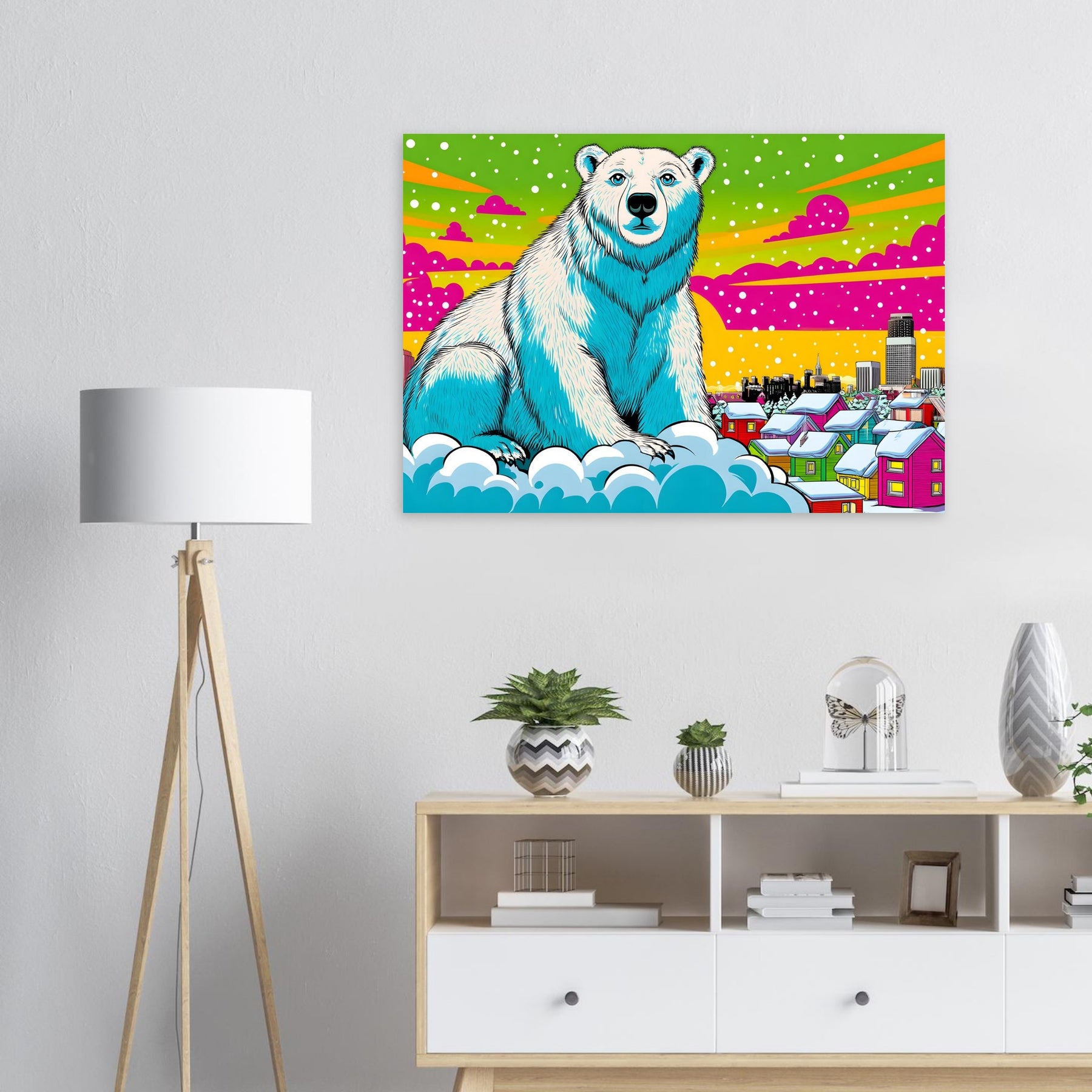 dd imagination and bold color to your space with Skyline Polar Dream, a striking pop art aluminum wall art featuring a majestic polar bear sitting atop soft clouds. Set against a vibrant city backdrop filled with colorful houses and a whimsical sky of vivid hues, the artwork blends fantasy, urban charm, and playful pop art energy into a truly eye-catching scene.