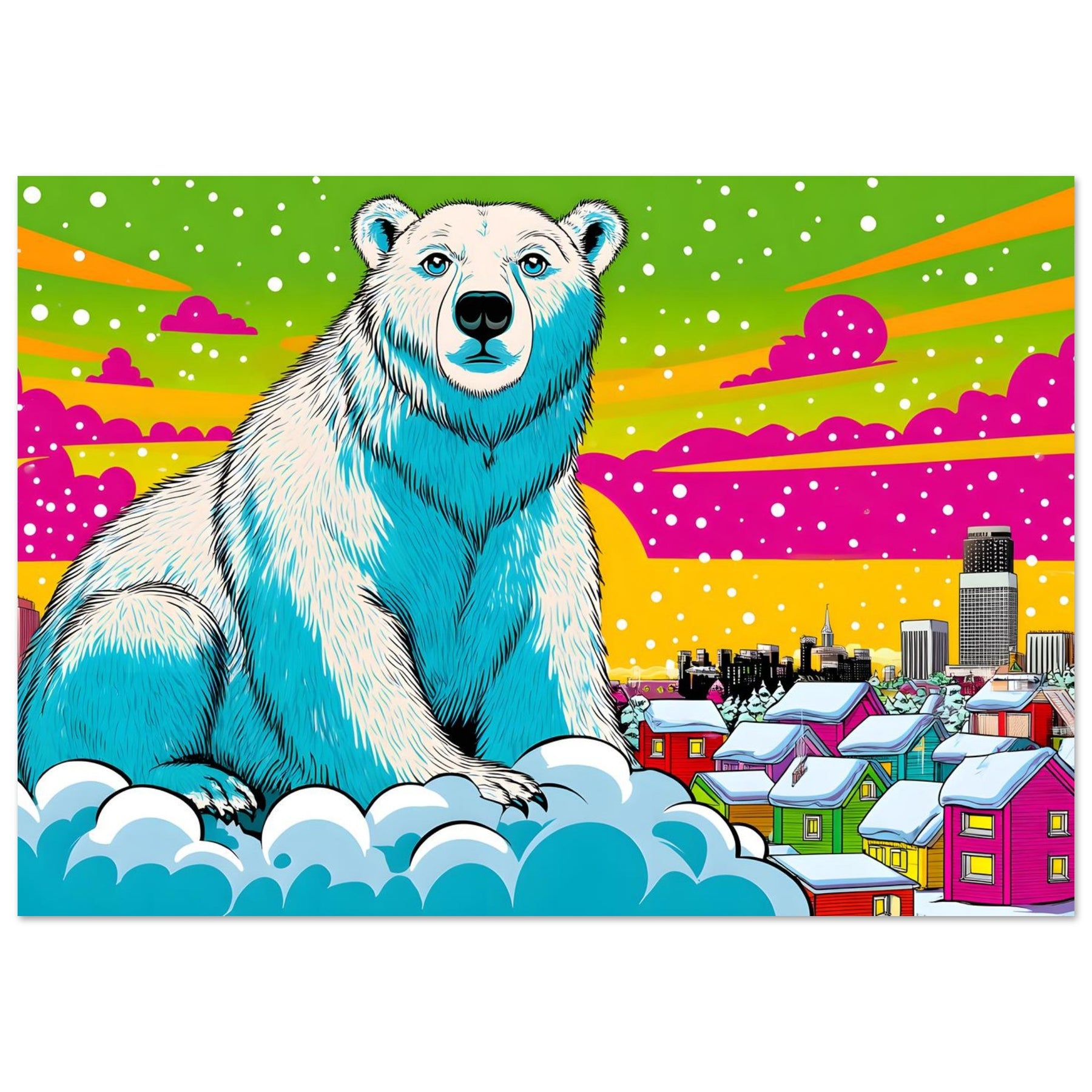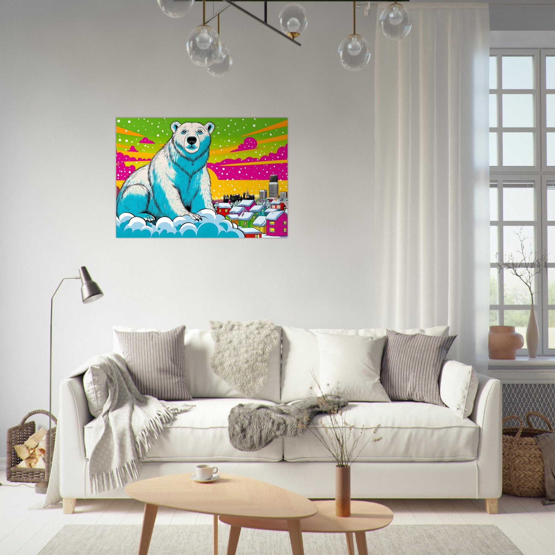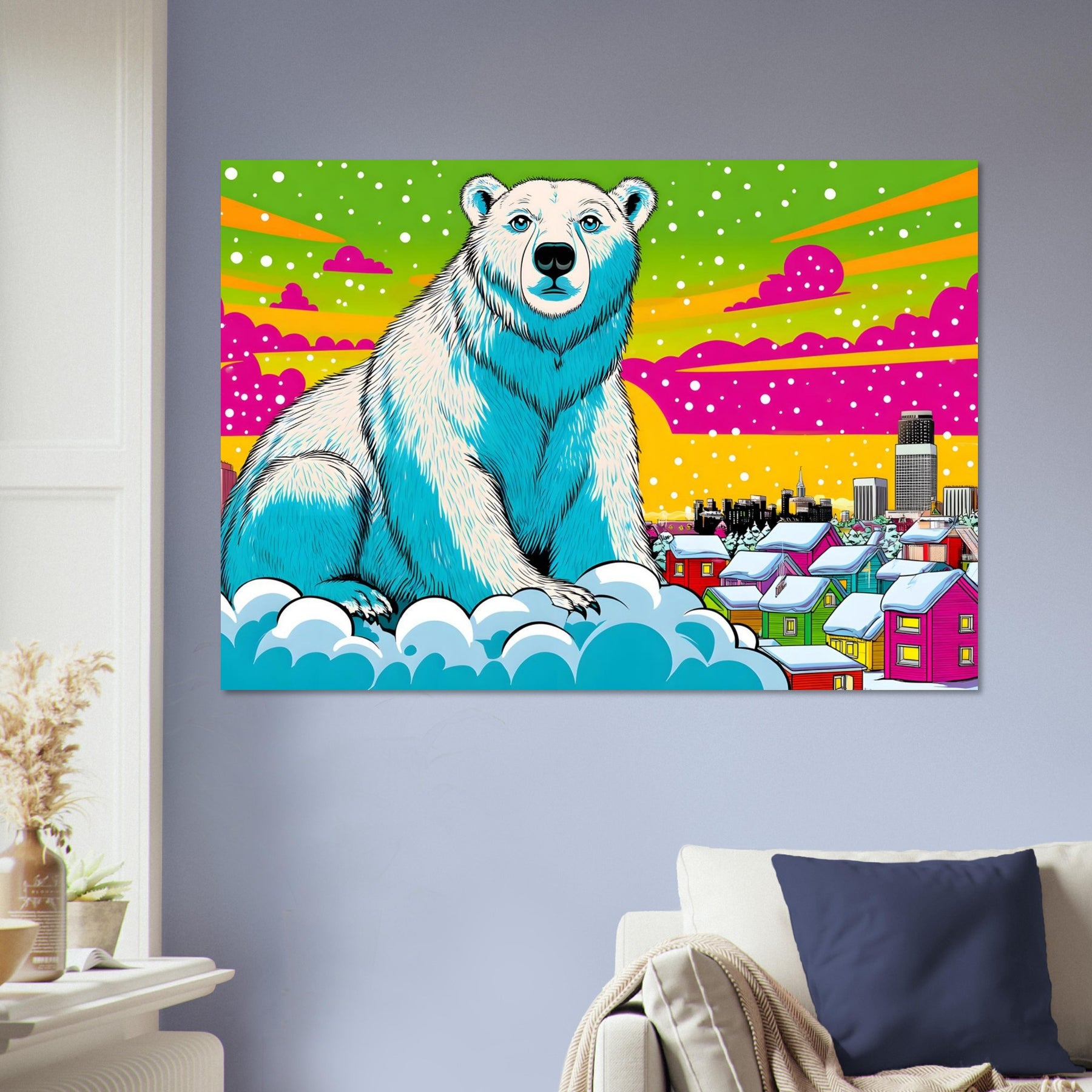dd imagination and bold color to your space with Skyline Polar Dream, a striking pop art aluminum wall art featuring a majestic polar bear sitting atop soft clouds. Set against a vibrant city backdrop filled with colorful houses and a whimsical sky of vivid hues, the artwork blends fantasy, urban charm, and playful pop art energy into a truly eye-catching scene.