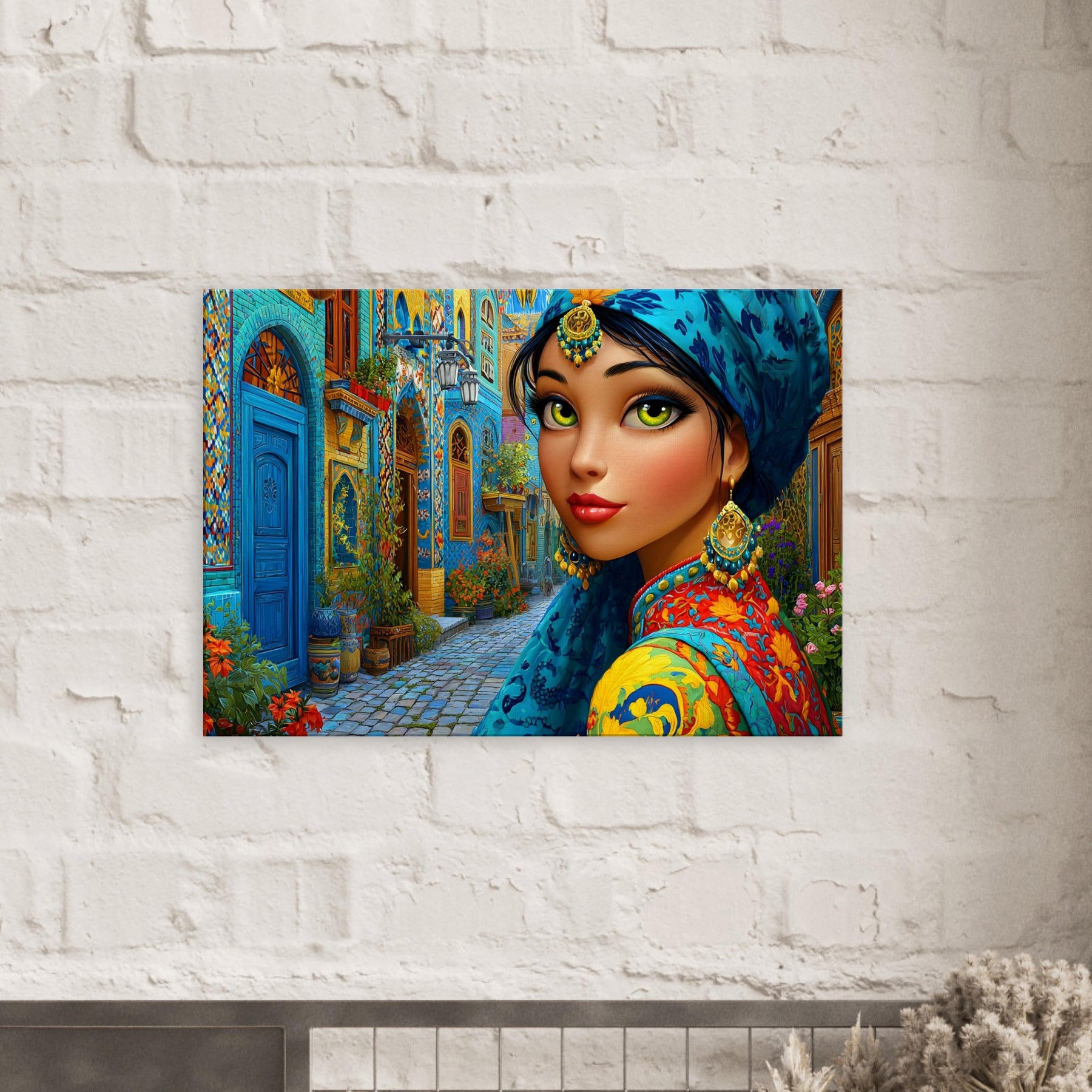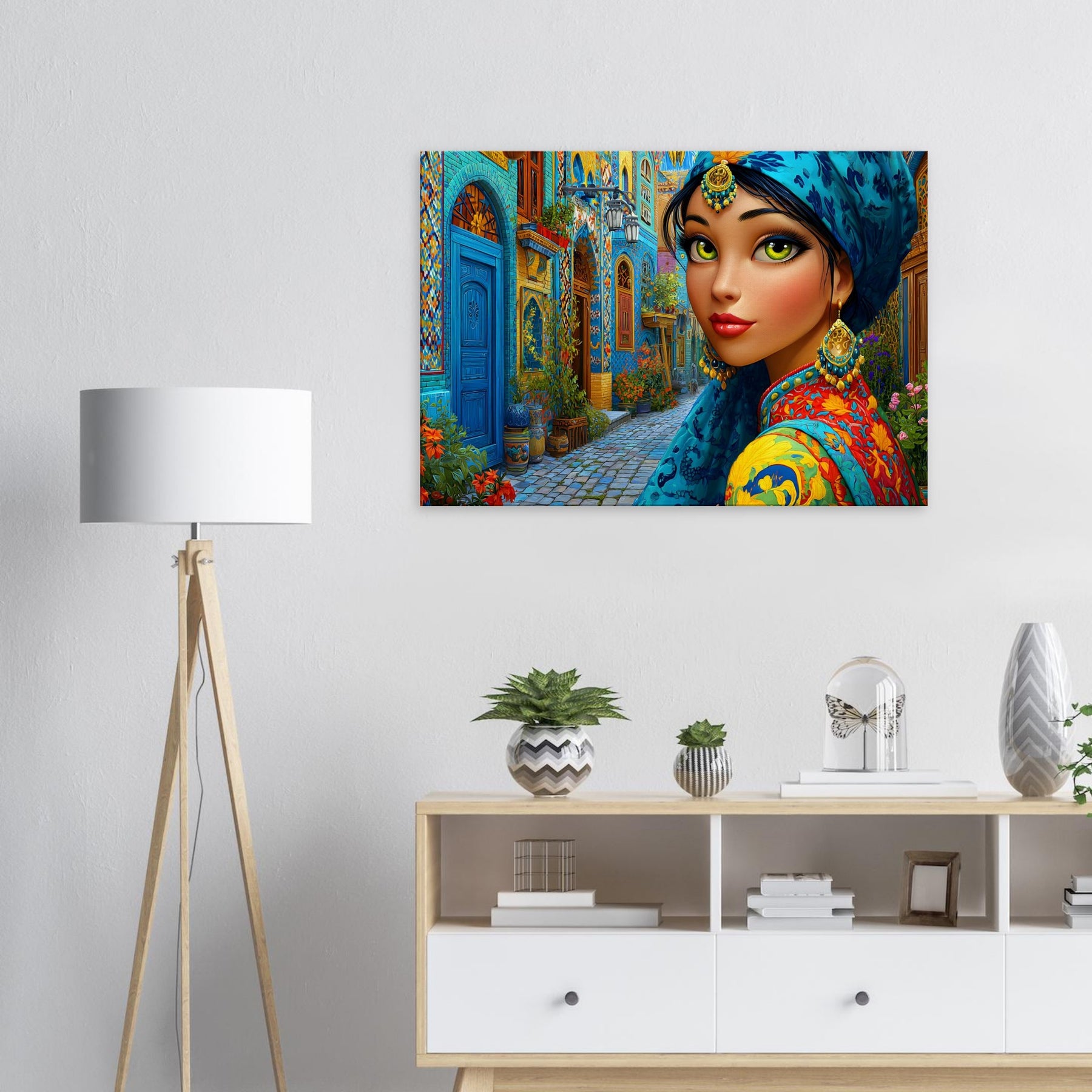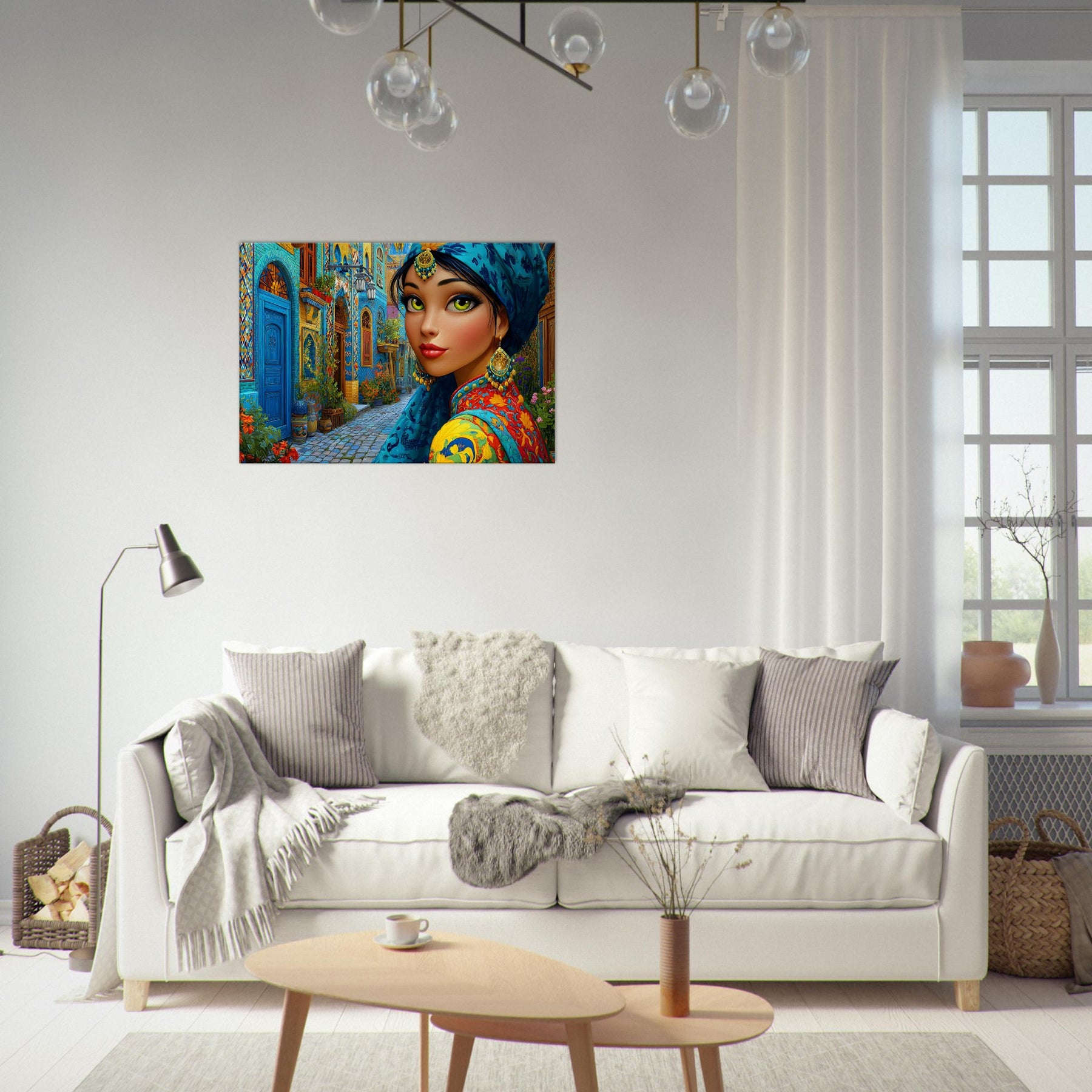 Add elegance and vibrancy to your home with our Grace in Color Canvas Wall Art. This stunning portrait captures a young woman in colorful attire, gracefully posing in a charming alley adorned with blooming flowers and rich architectural details. The textured canvas finish adds depth and warmth, making it a lively focal point for any room.