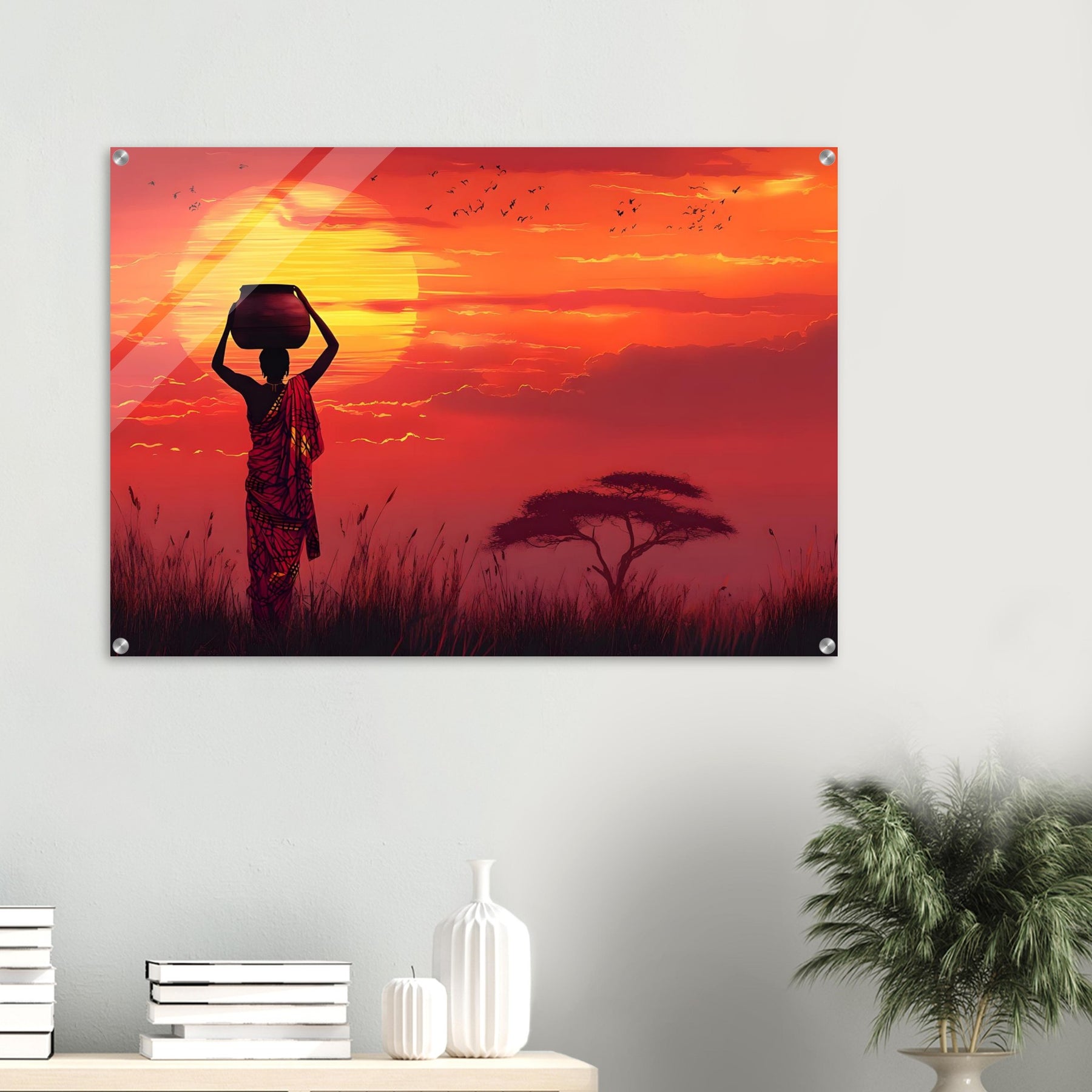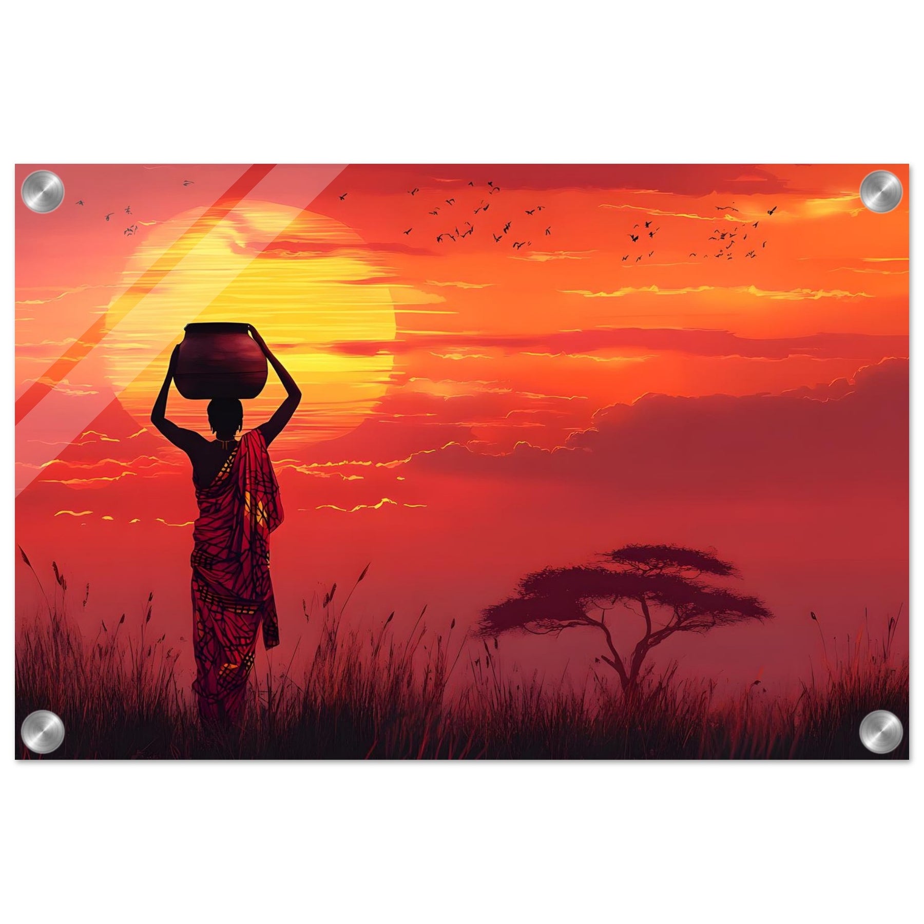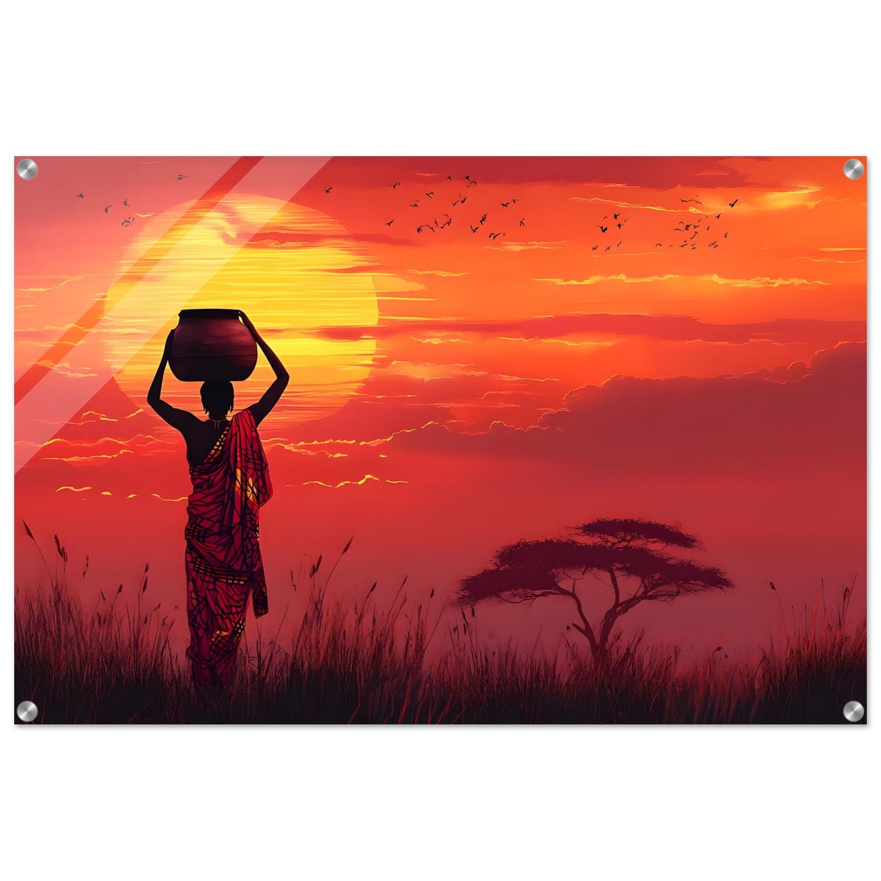 Create a luminous focal point with Golden Horizon, a striking acrylic wall art piece that intensifies the glowing sunset and sharp silhouettes. The glossy, glass-like surface enhances depth and vibrancy for a truly immersive visual experience.