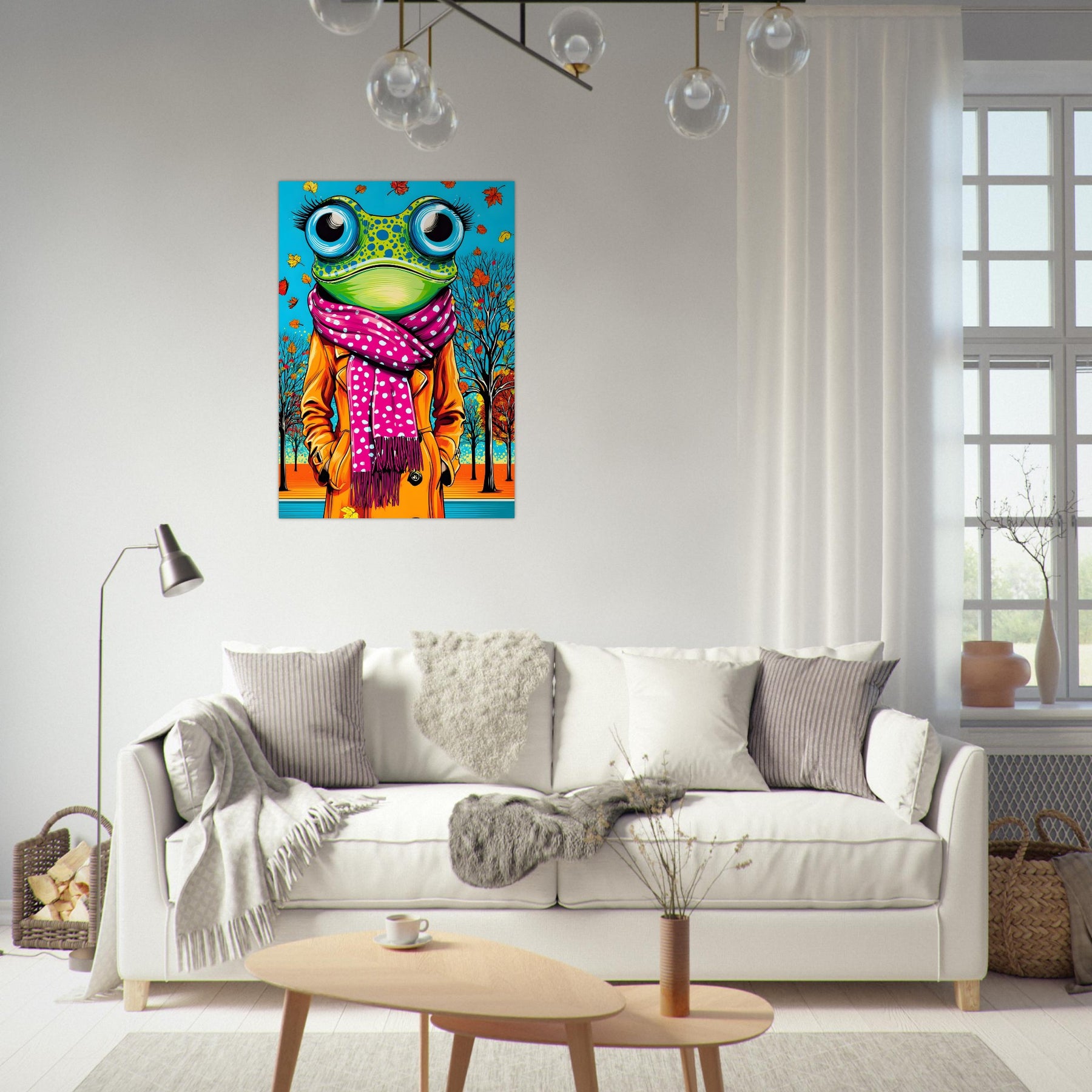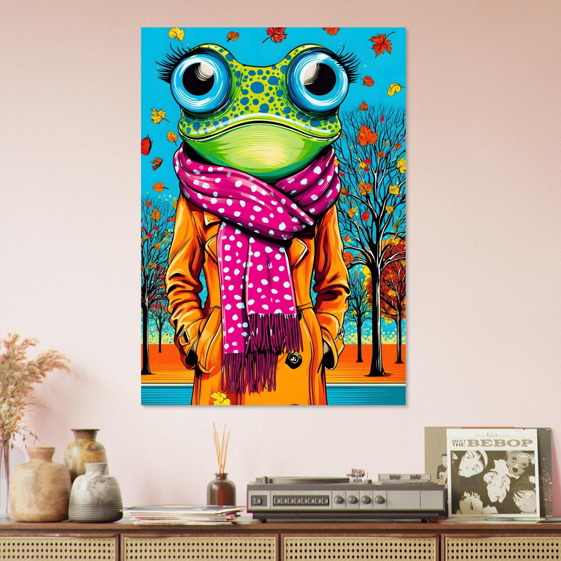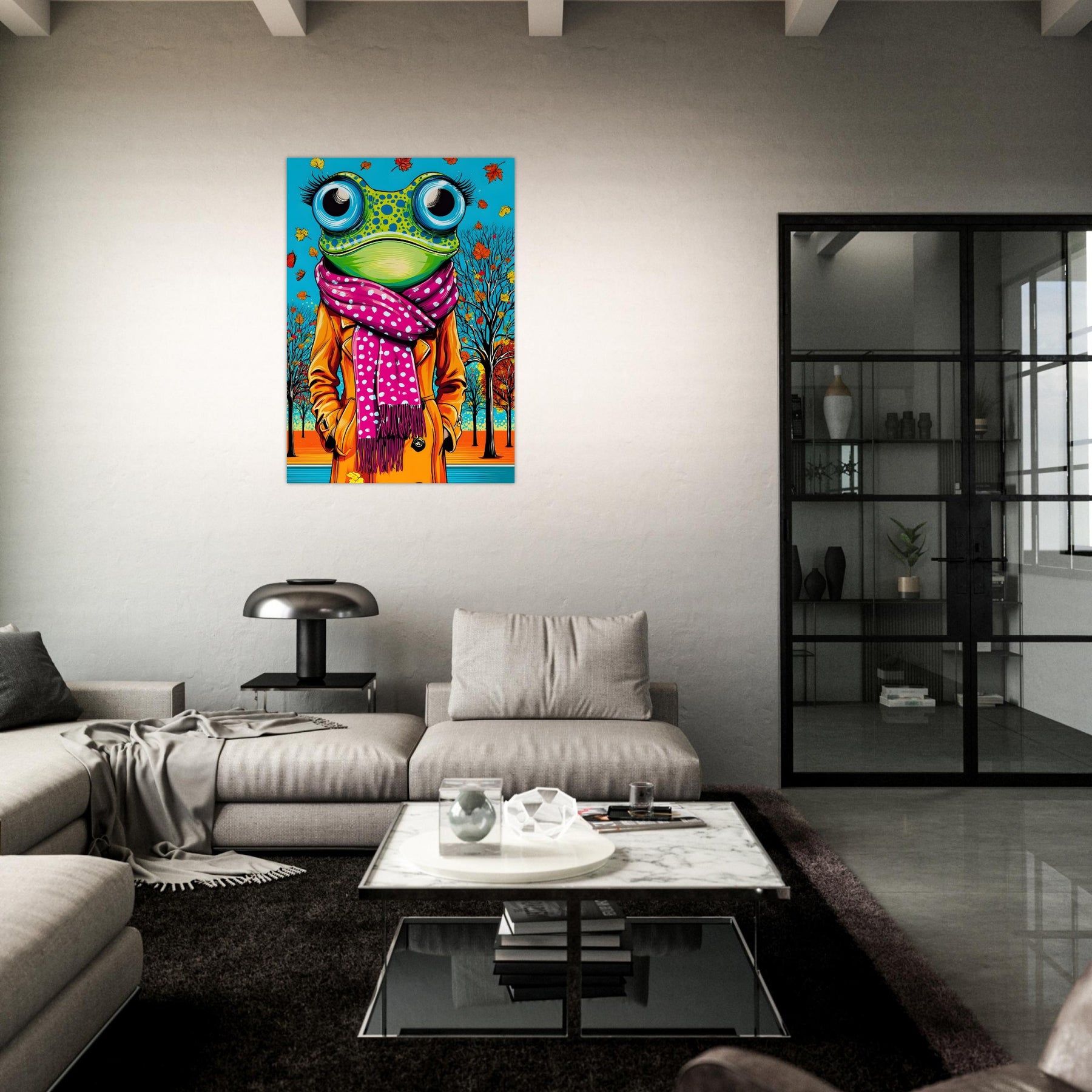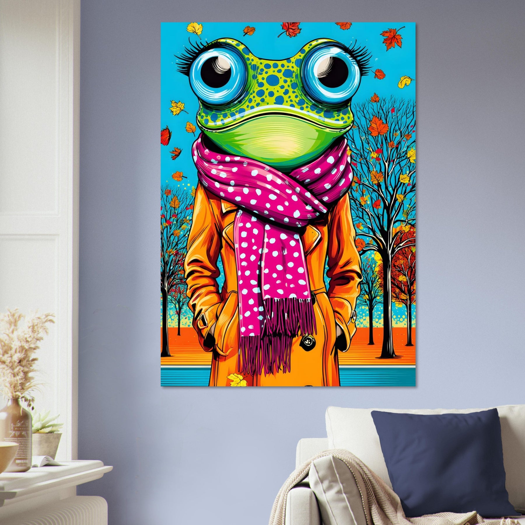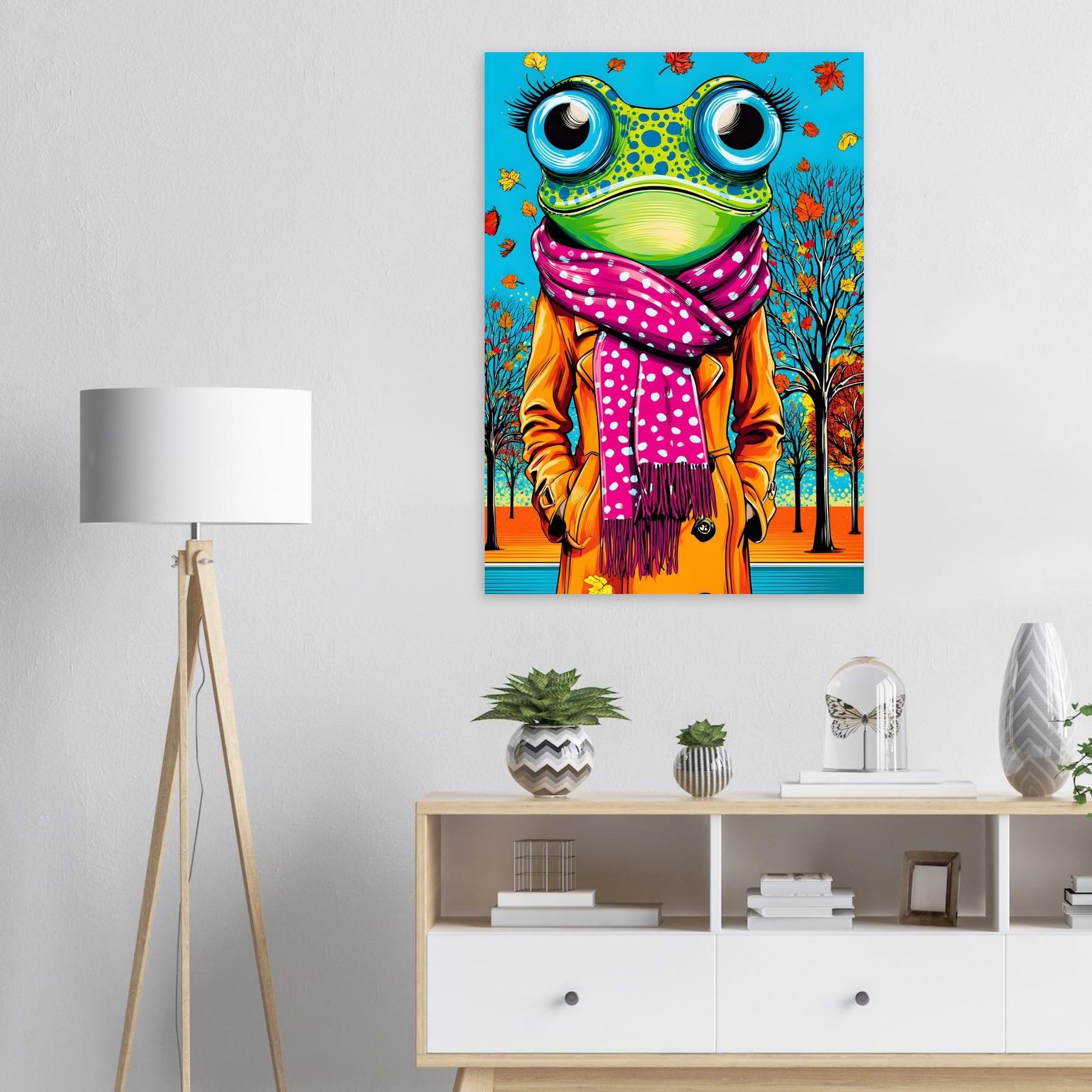 Bring playful seasonal style into your space with Autumn Frog Chic, a vibrant pop art aluminum wall art featuring a whimsical frog dressed in a stylish scarf and coat. Set against a colorful autumn backdrop, the illustration blends natural elements with playful fashion details, creating a lively and imaginative pop art scene.