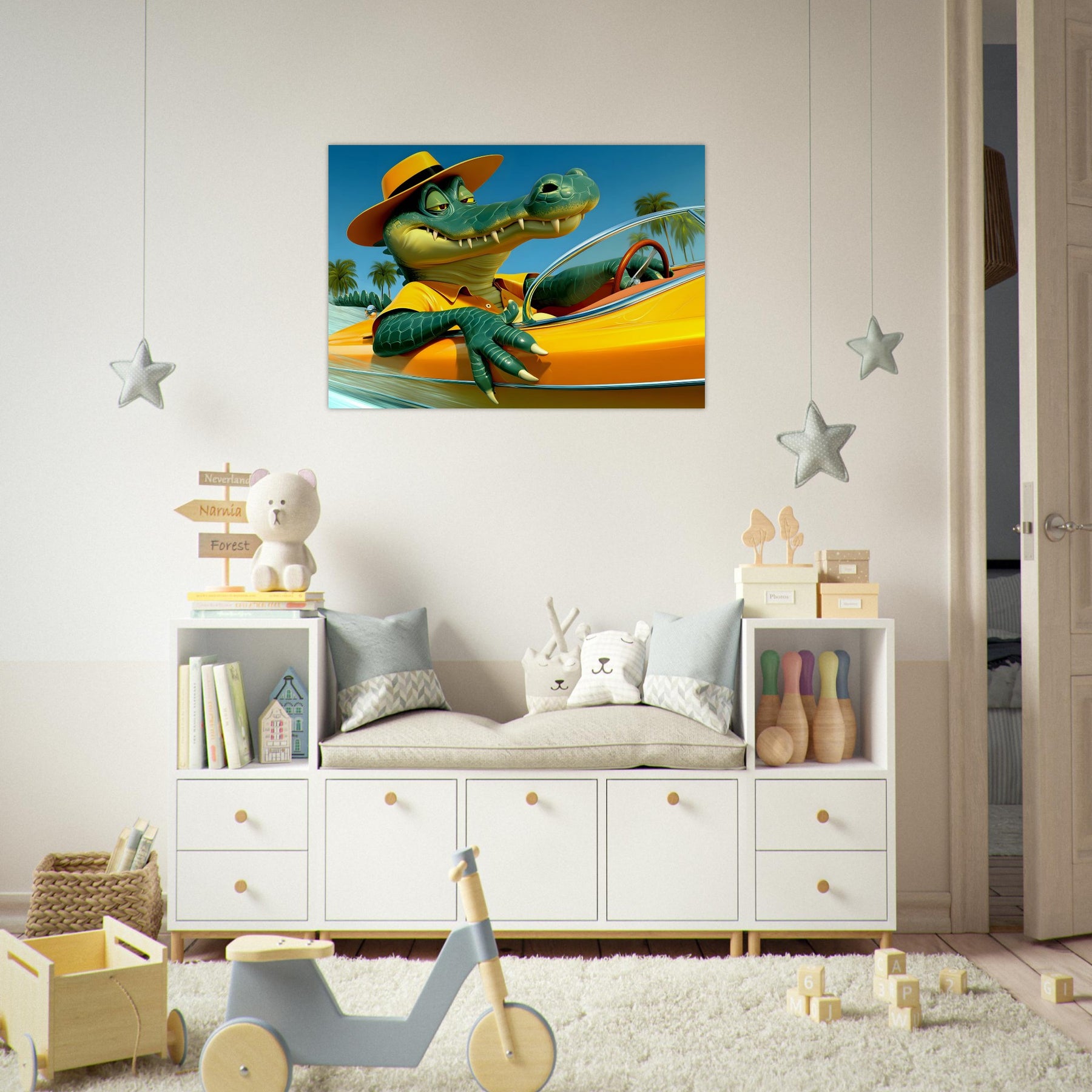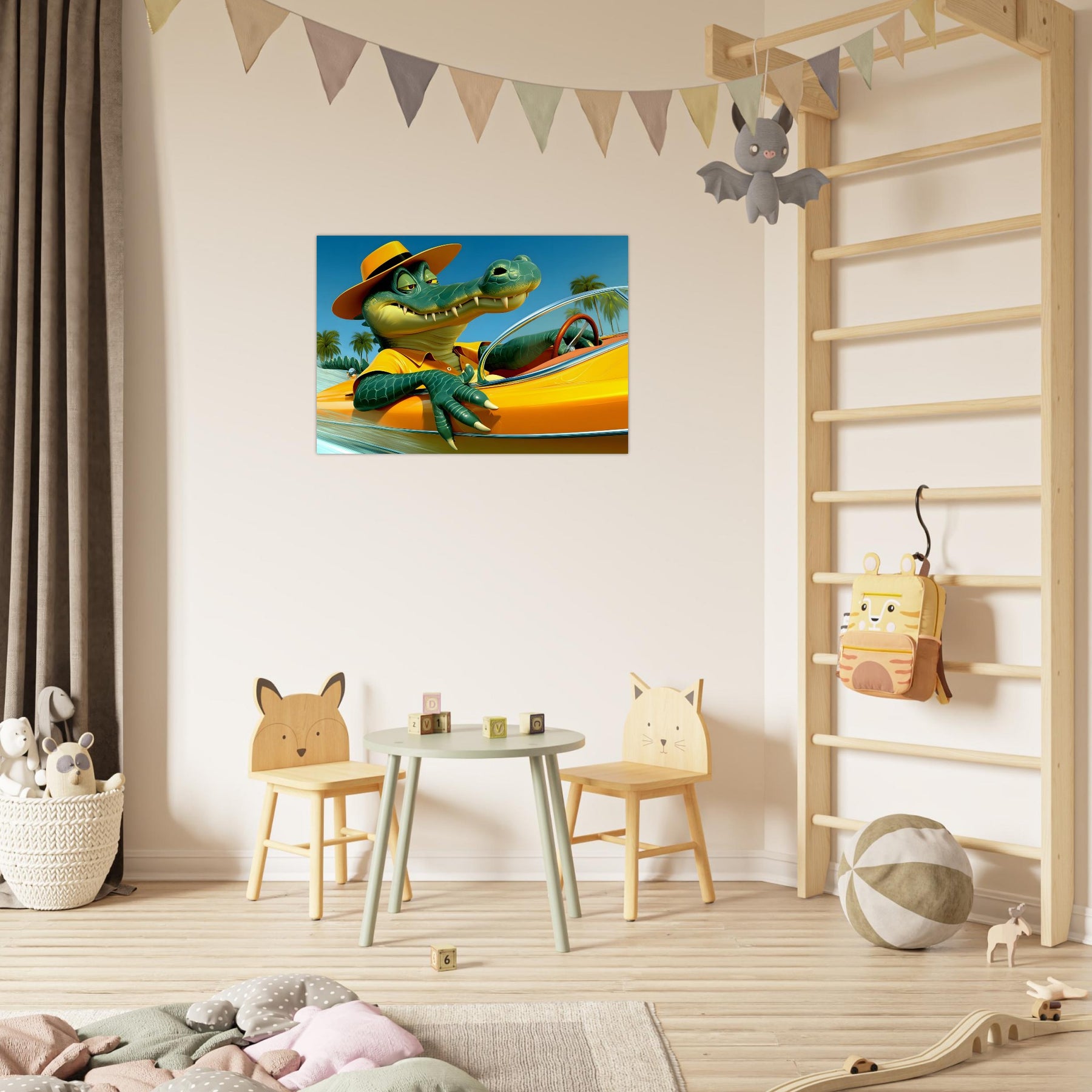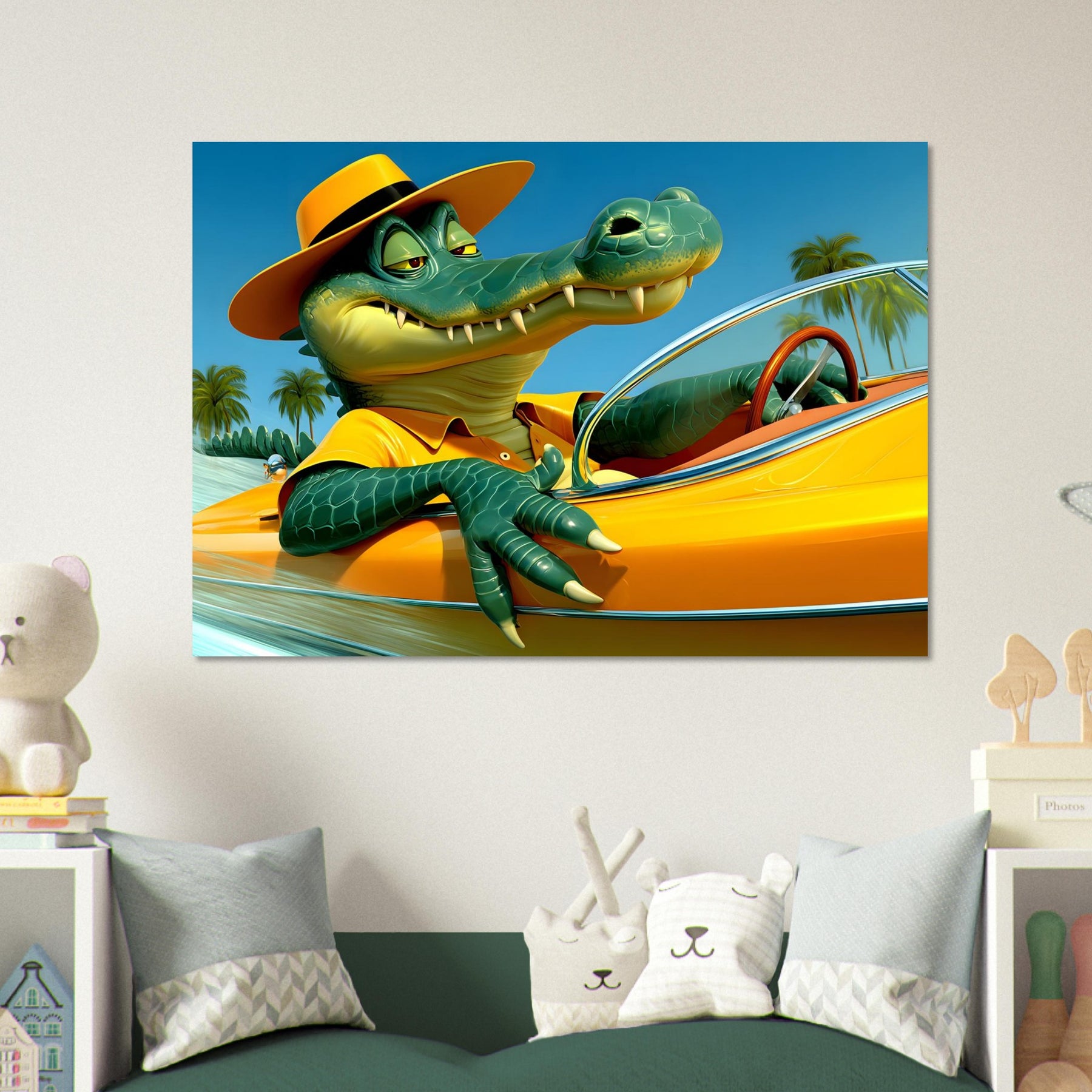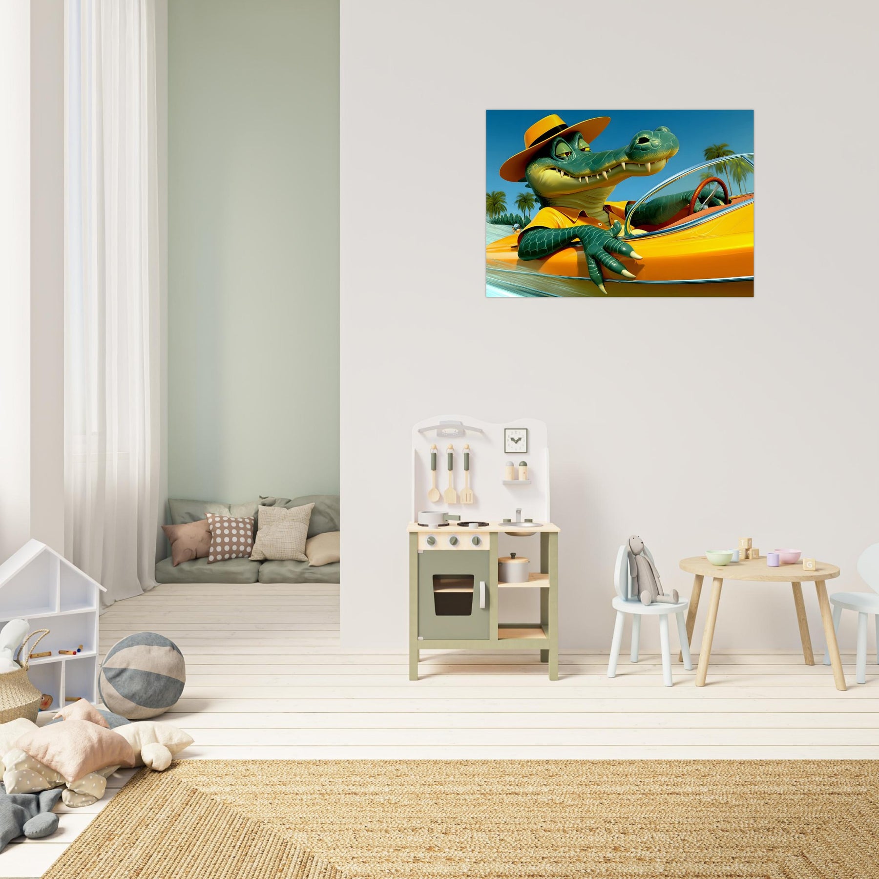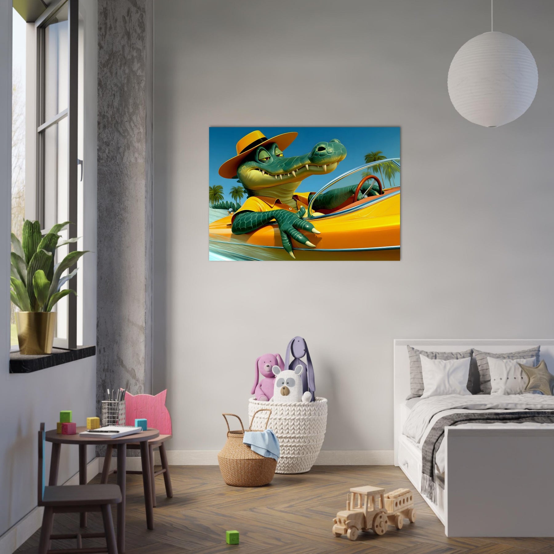 Bring playful energy and bold style into your child’s room with our Cool Gator Vibes Aluminum Wall Art. This whimsical artwork features a stylish alligator in sunglasses and a hat, confidently cruising in a vibrant orange vintage speedboat. Surrounded by palm trees and clear blue skies, the scene radiates fun, adventure, and carefree charm—perfect for sparking imagination and joy. Printed on sleek aluminum, the design pops with vivid color and sharp detail, making it a standout décor piece.