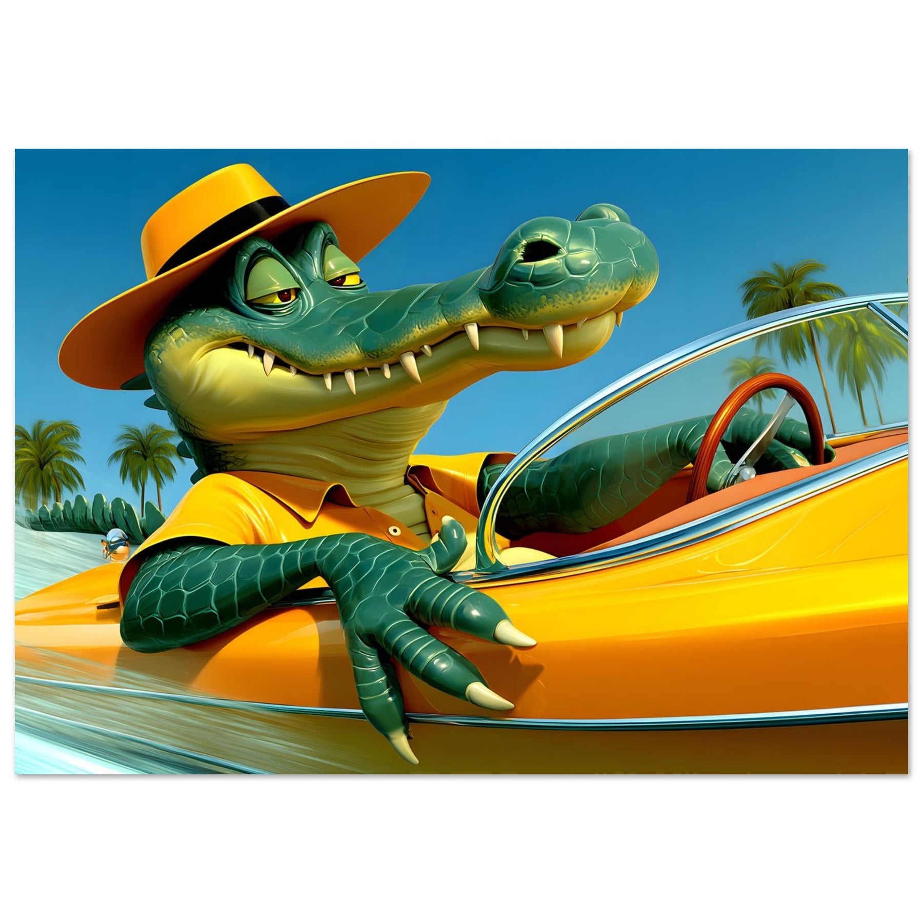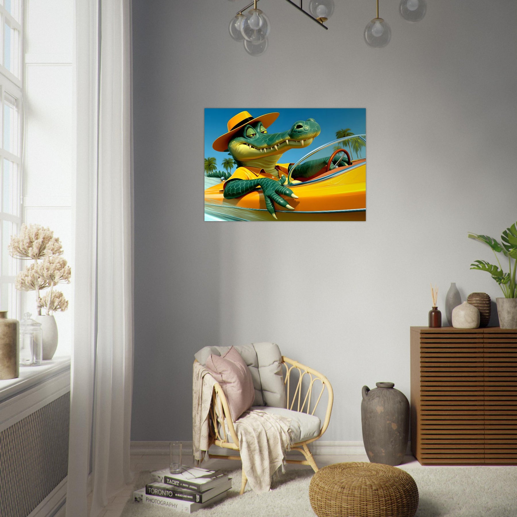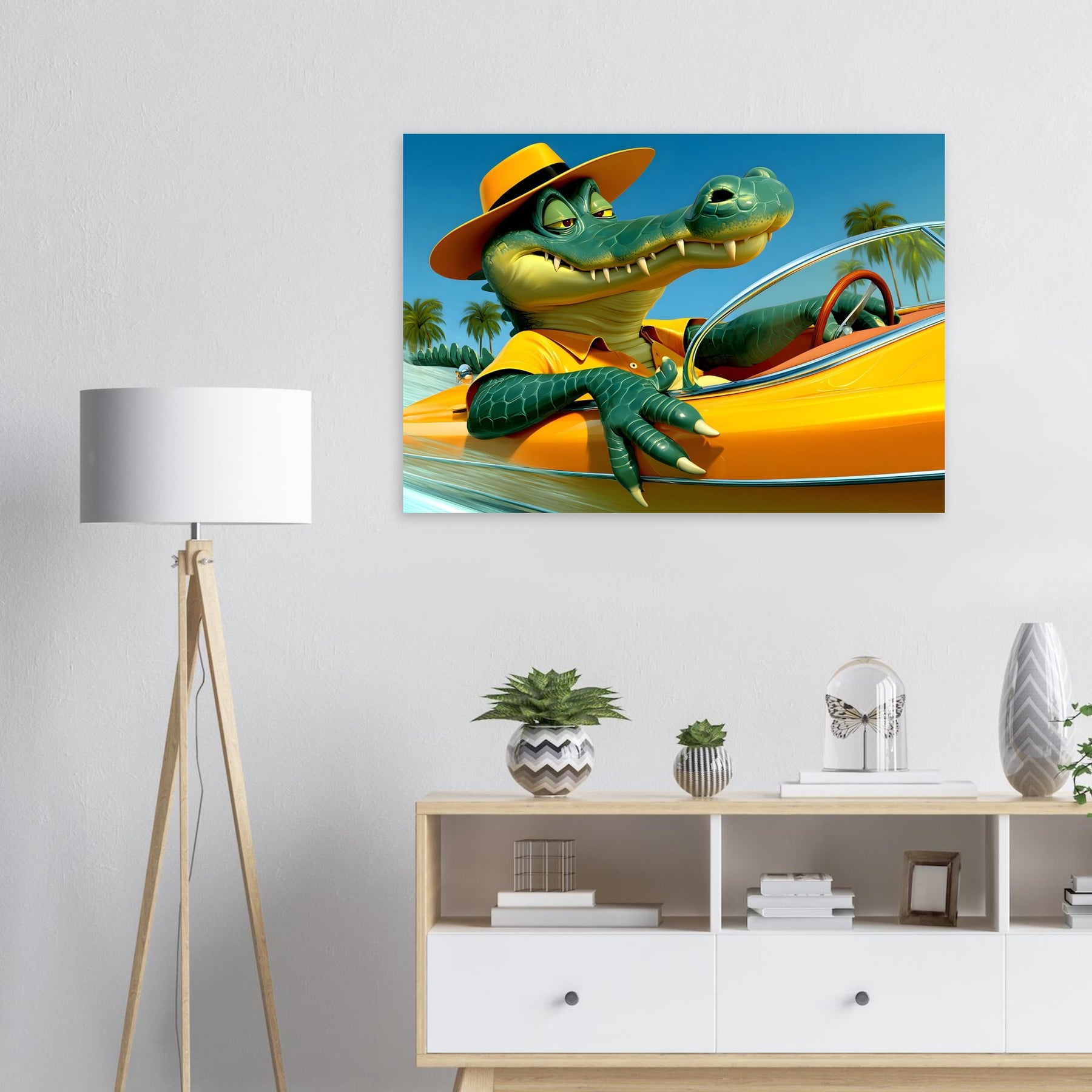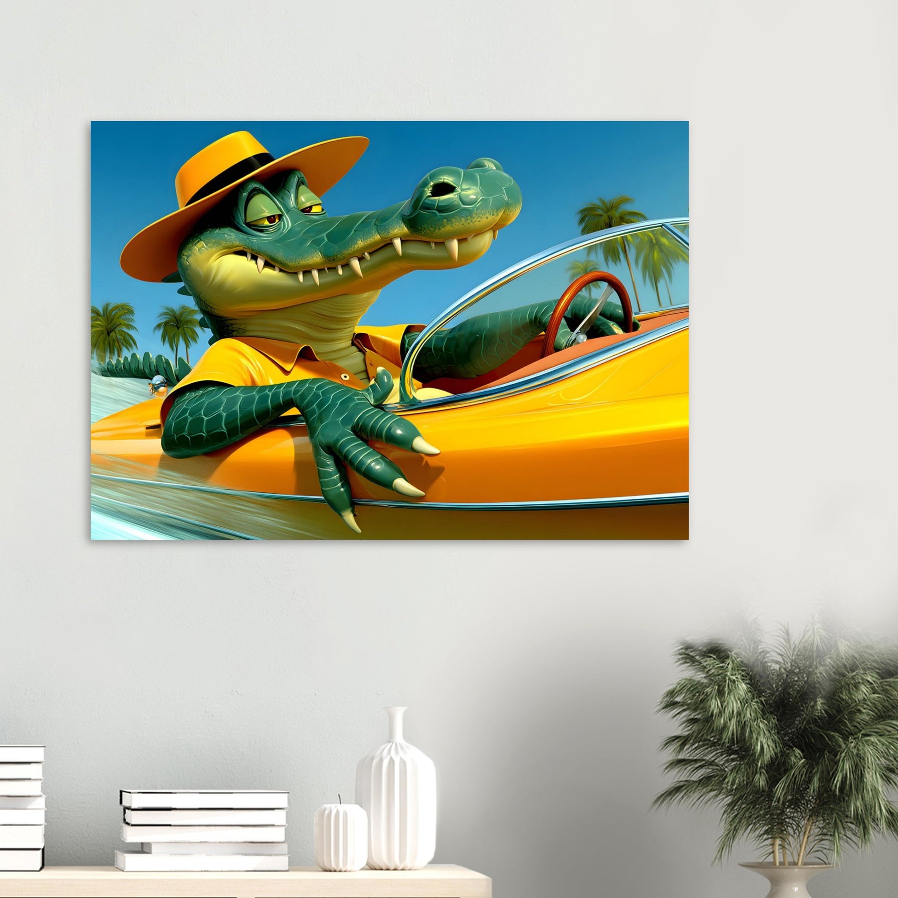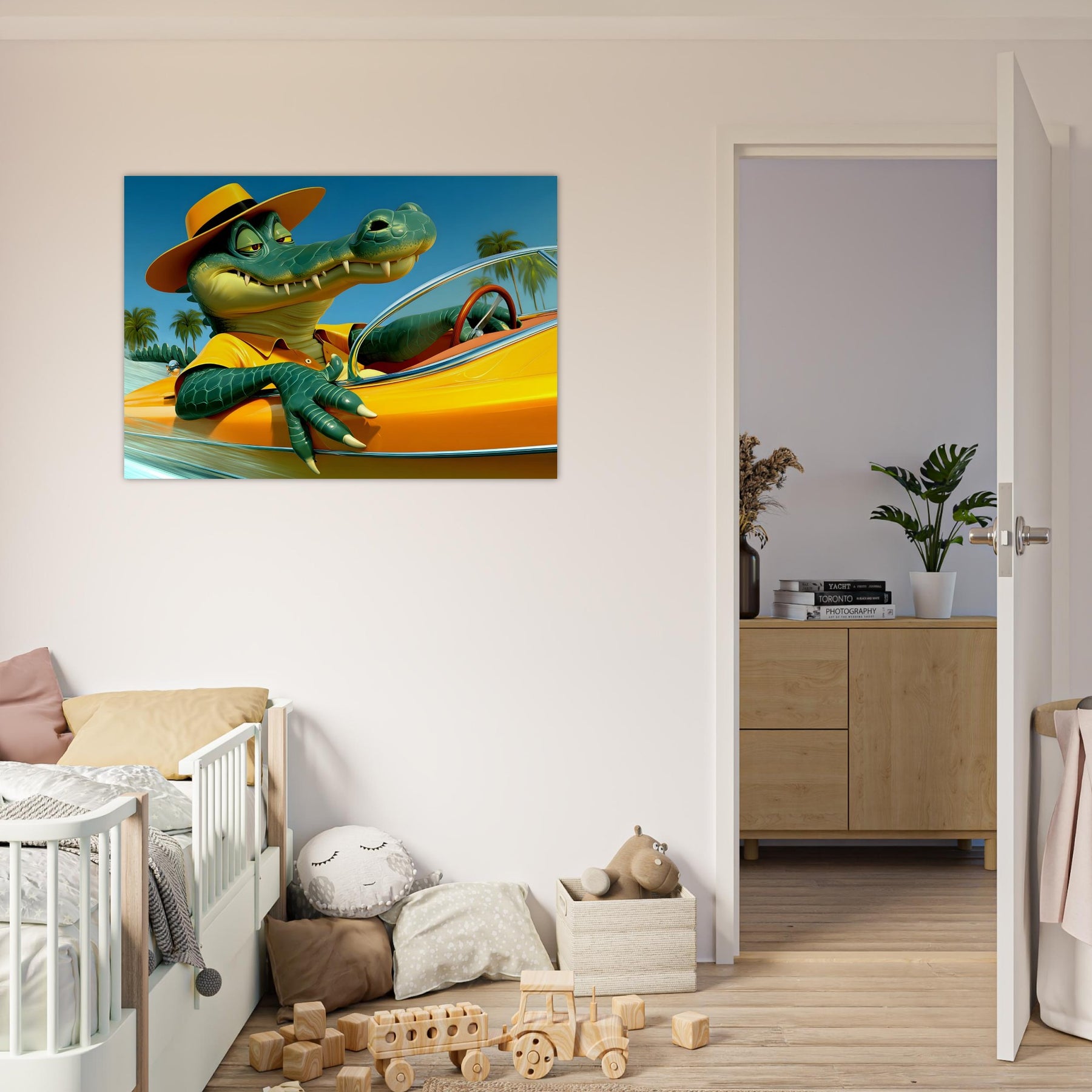Bring playful energy and bold style into your child’s room with our Cool Gator Vibes Aluminum Wall Art. This whimsical artwork features a stylish alligator in sunglasses and a hat, confidently cruising in a vibrant orange vintage speedboat. Surrounded by palm trees and clear blue skies, the scene radiates fun, adventure, and carefree charm—perfect for sparking imagination and joy. Printed on sleek aluminum, the design pops with vivid color and sharp detail, making it a standout décor piece.