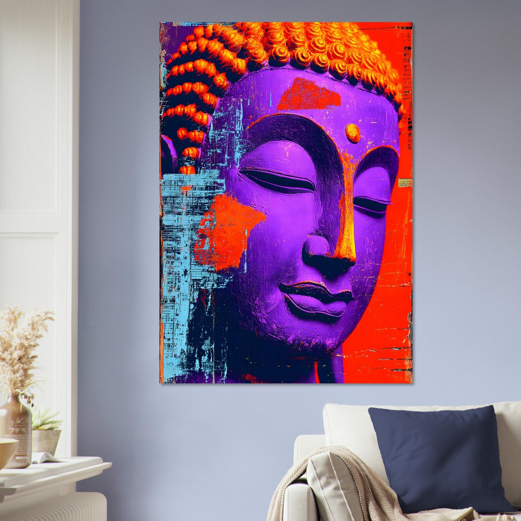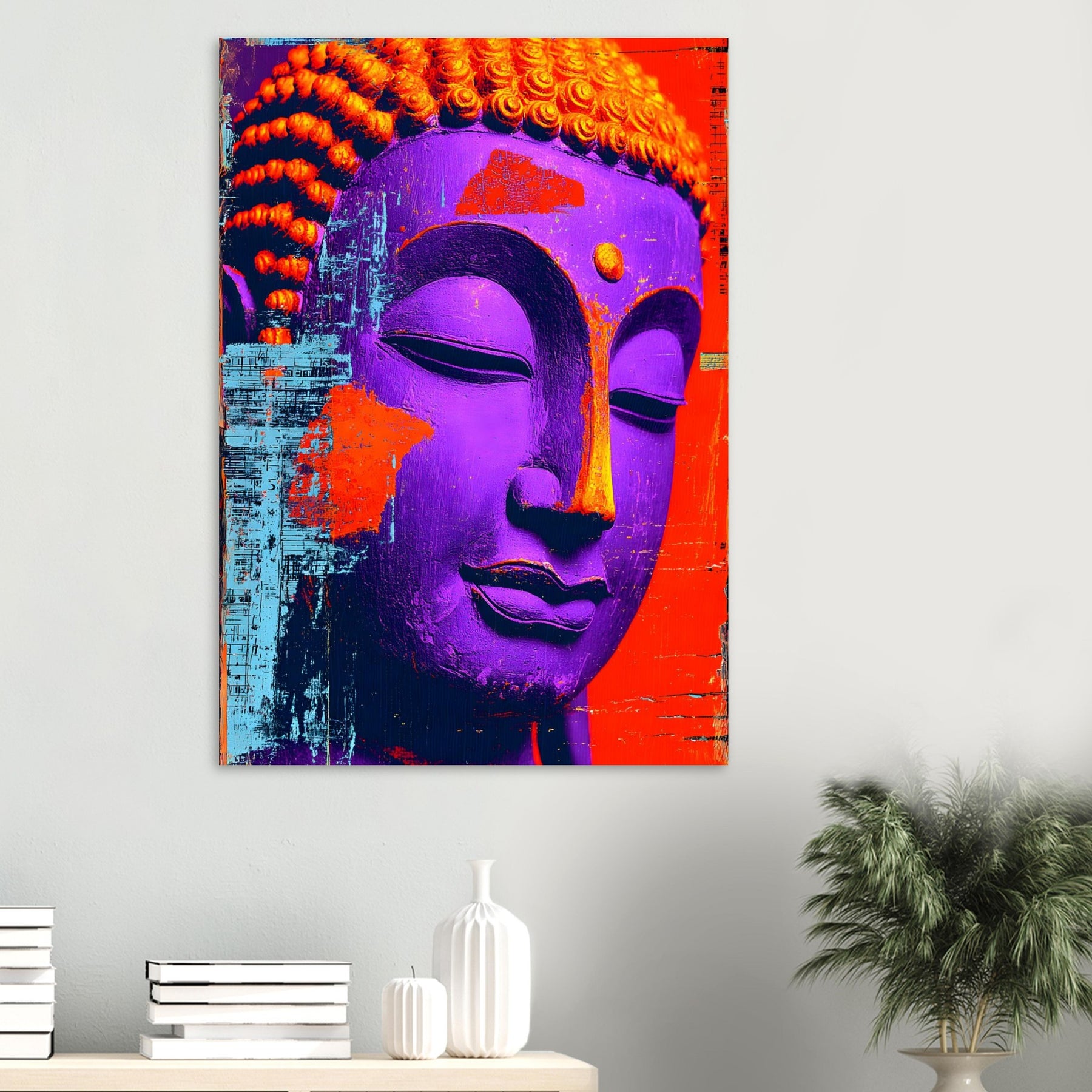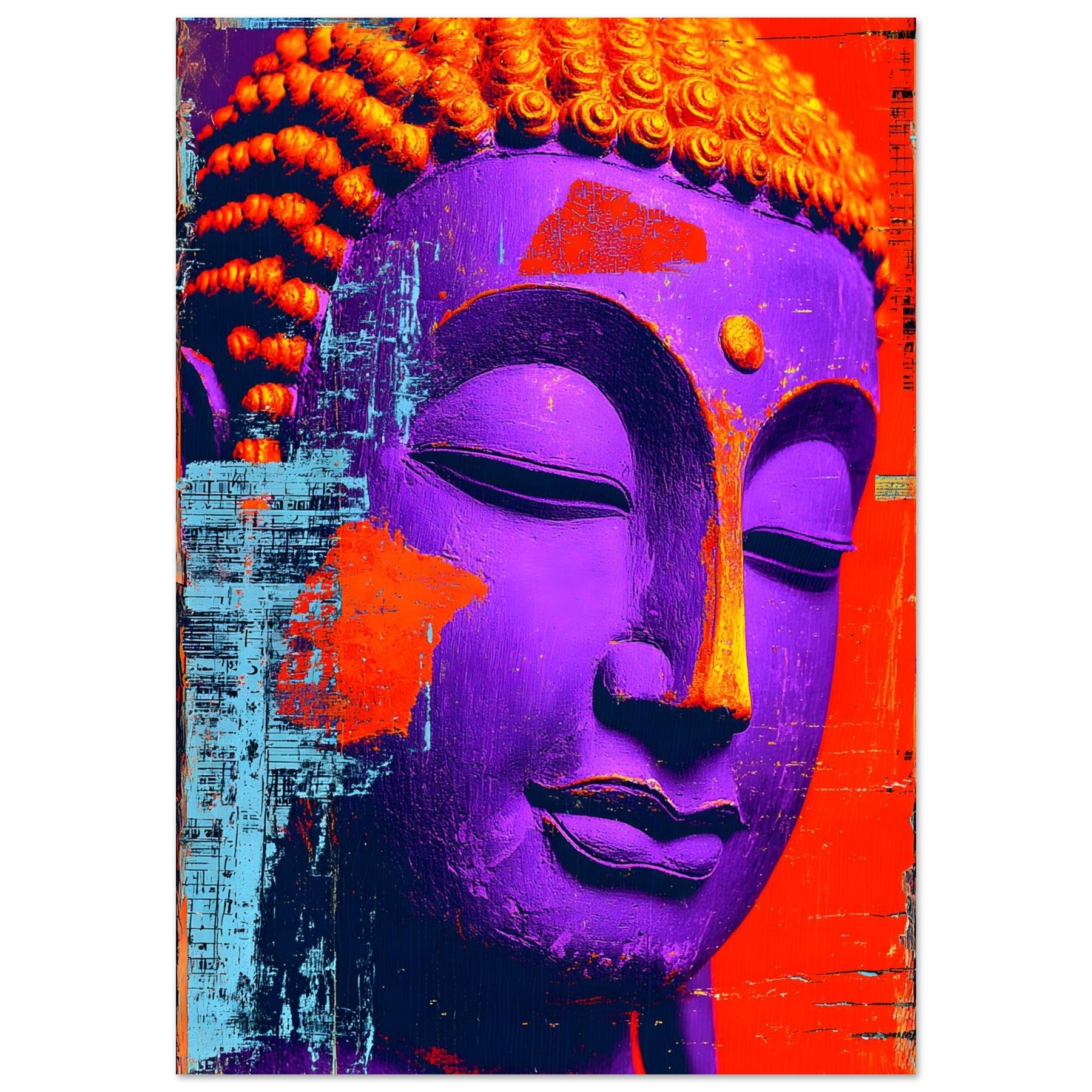 Transform your space with Textured Tranquility, a striking aluminum wall art piece featuring a close-up of a vibrant Buddha face brought to life through bold colors and distinctive textures. The expressive surface and rich palette evoke a sense of calm and mindful reflection while celebrating artistic freedom and modern spiritual expression.
