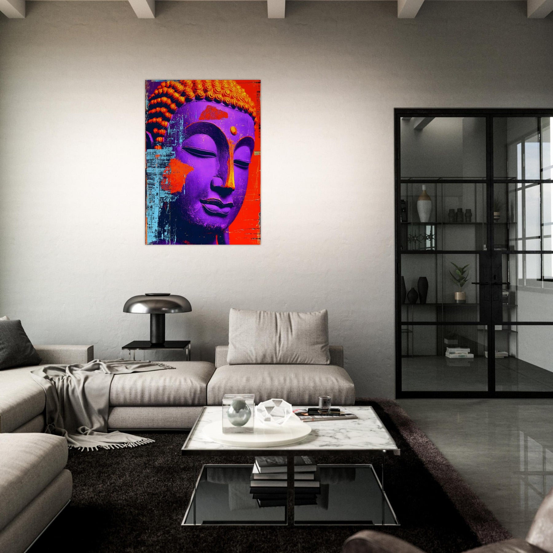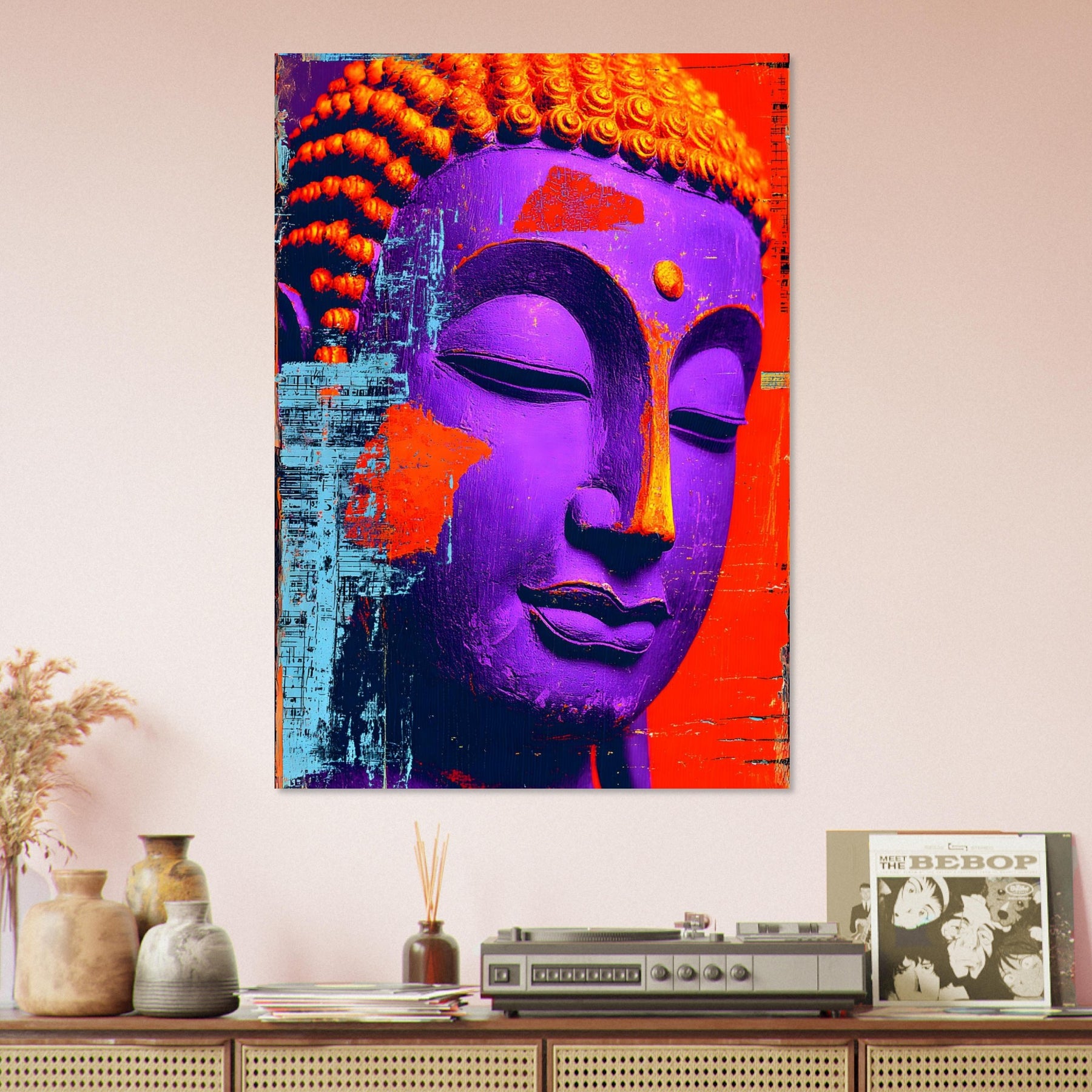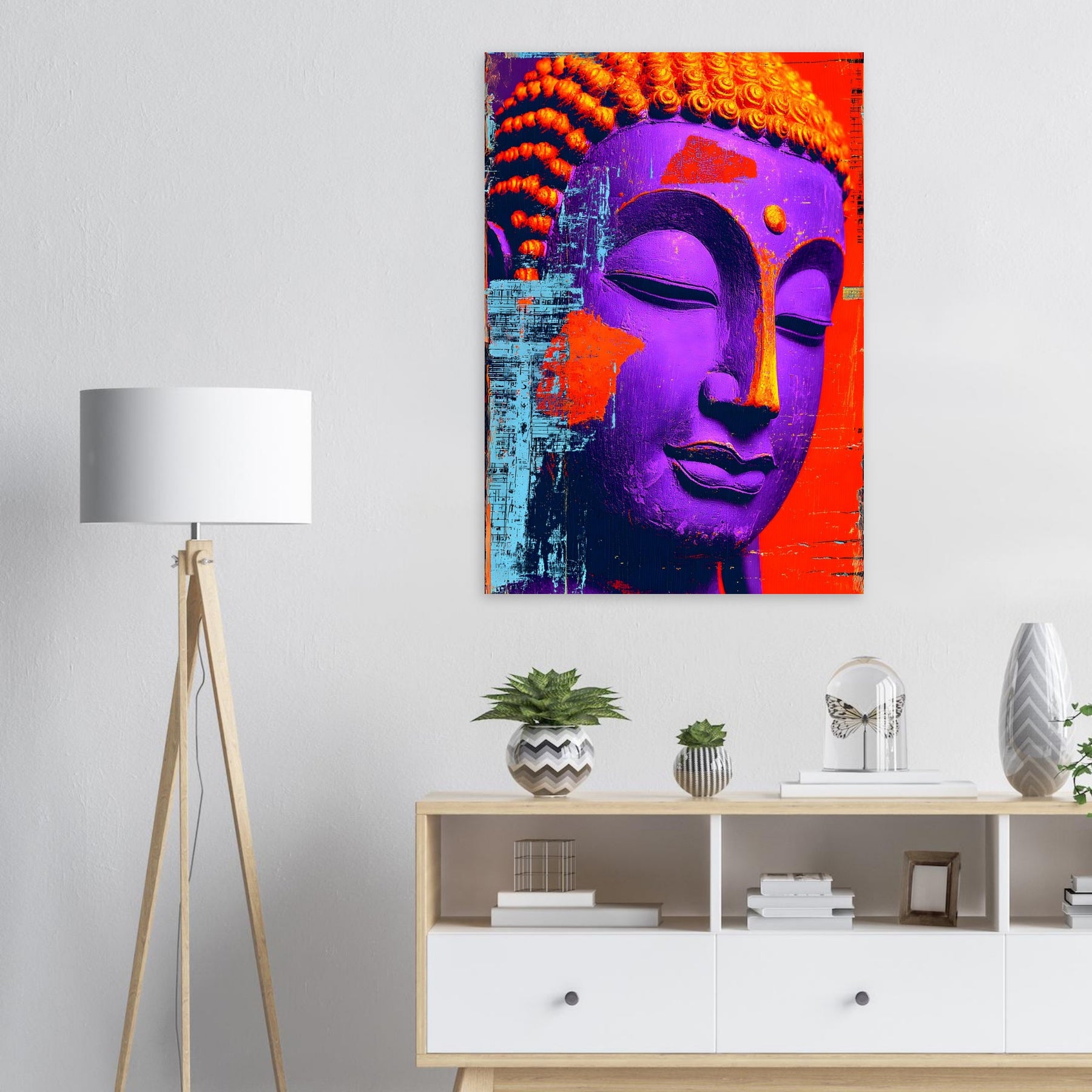 Transform your space with Textured Tranquility, a striking aluminum wall art piece featuring a close-up of a vibrant Buddha face brought to life through bold colors and distinctive textures. The expressive surface and rich palette evoke a sense of calm and mindful reflection while celebrating artistic freedom and modern spiritual expression.