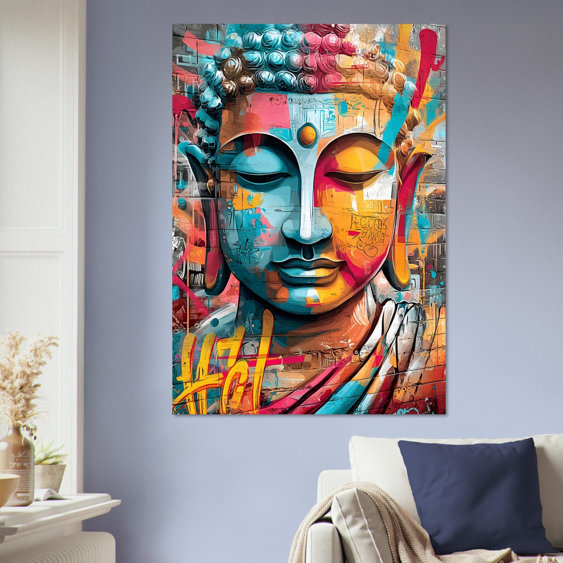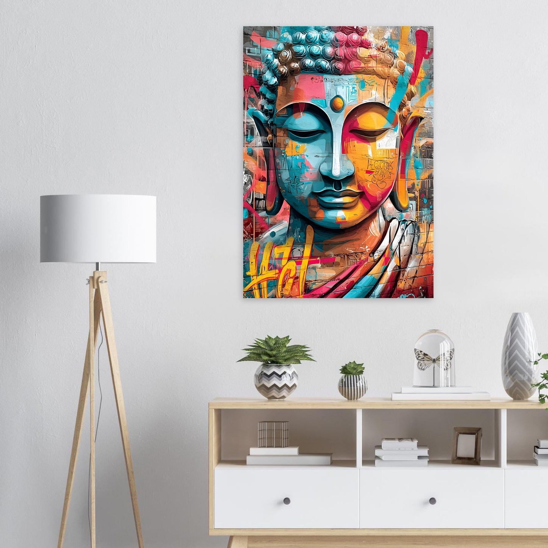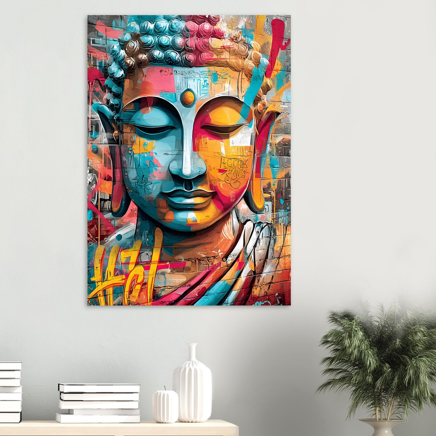 Transform your space with Urban Zen, a vibrant aluminum wall art piece featuring a stylized Buddha head infused with bold colors and expressive graffiti elements. This striking fusion of traditional spiritual symbolism and contemporary street art creates a powerful visual statement, balancing inner calm with modern creative energy.