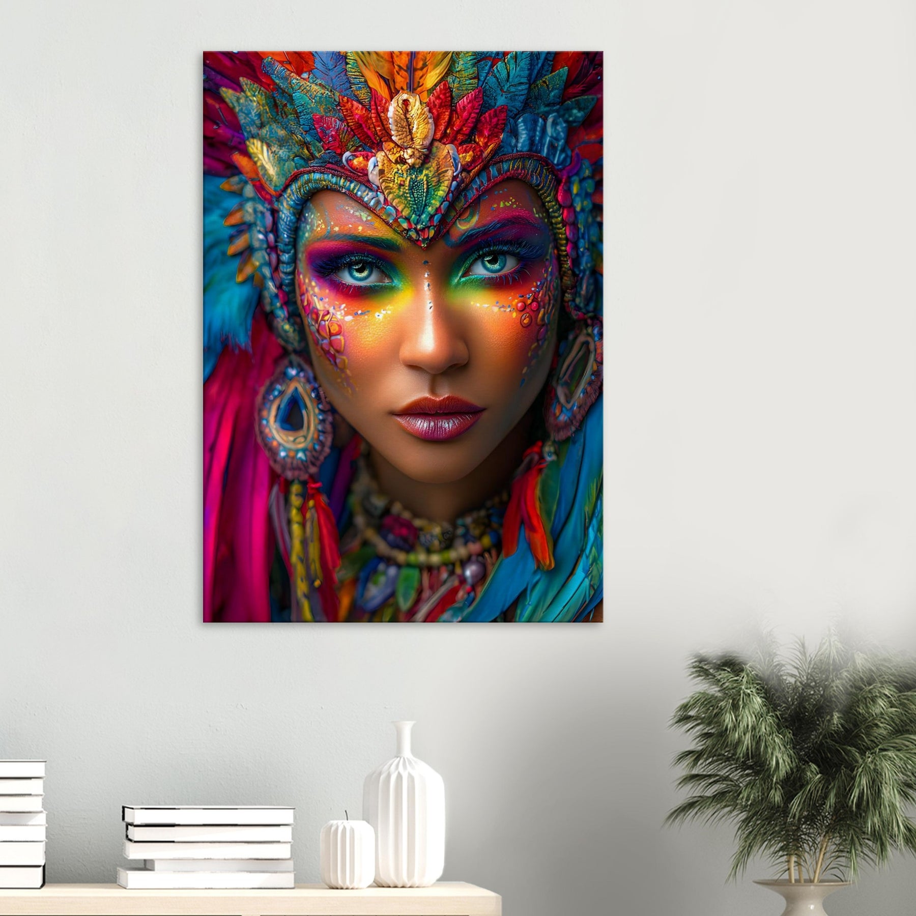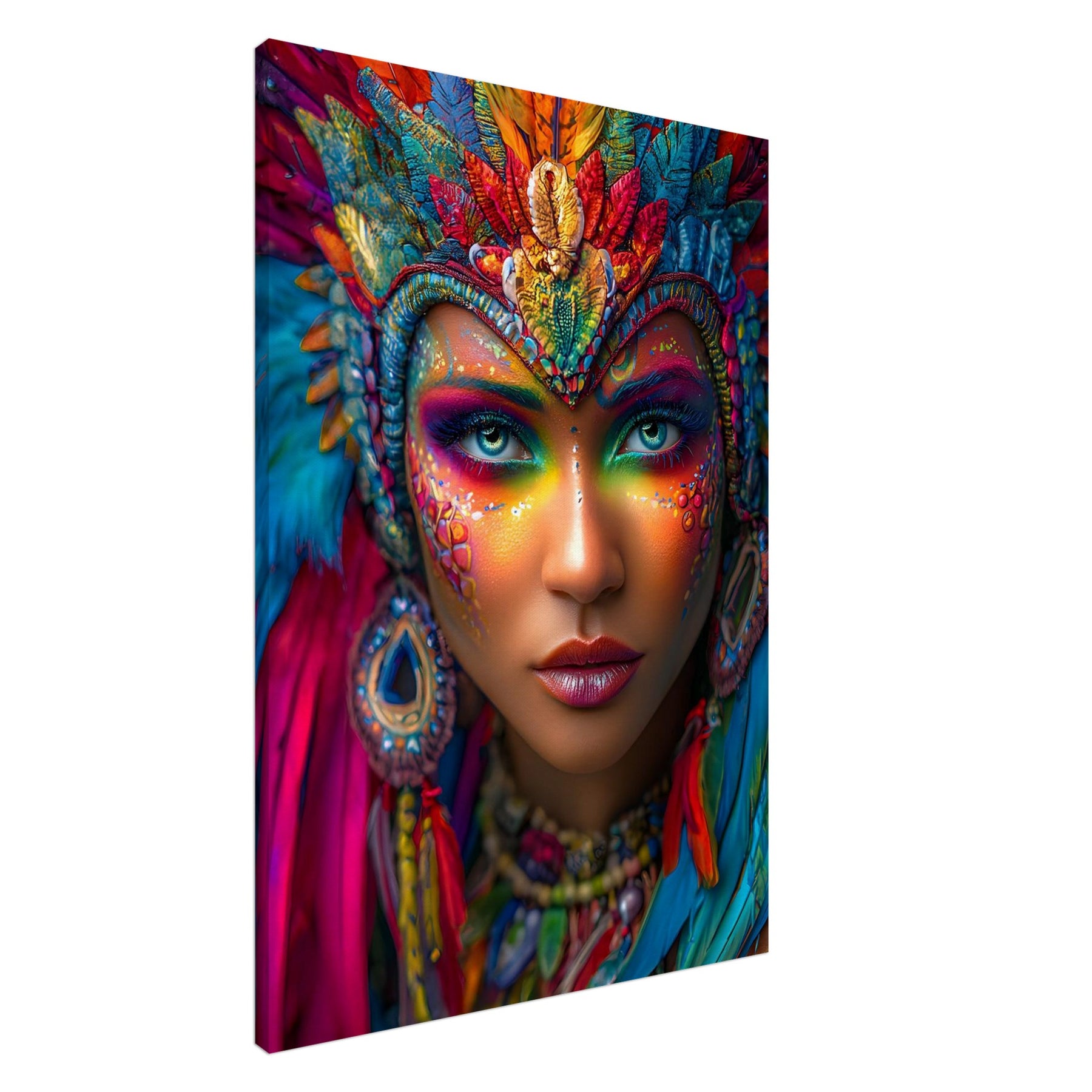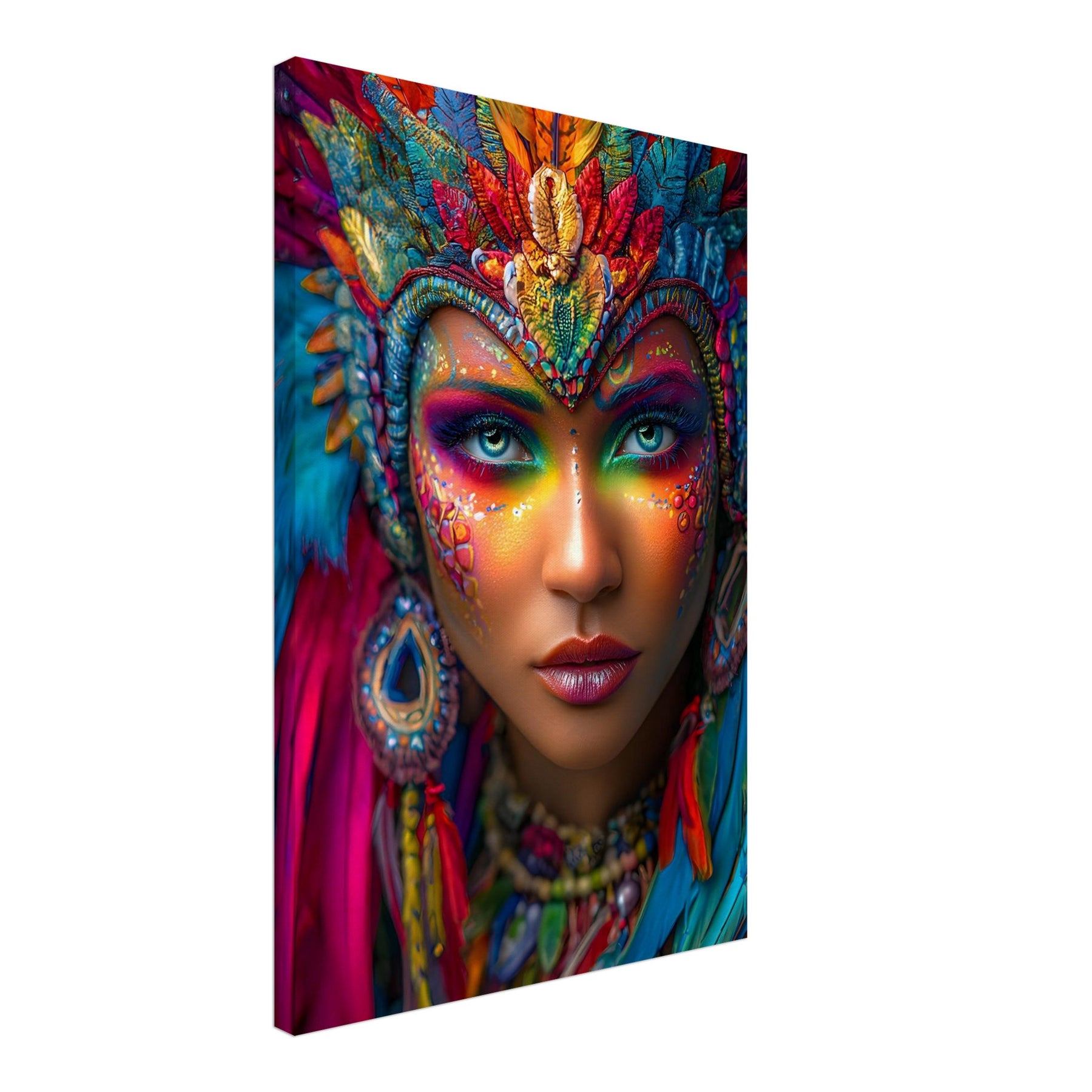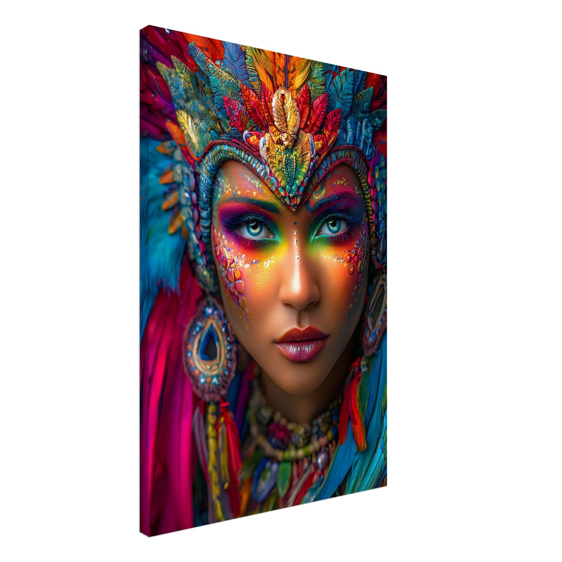 Transform your space with Carnival Spirit Muse, a striking canvas wall art piece that captures the energy and beauty of celebration. A powerful portrait of a woman adorned with vibrant carnival face art—colorful makeup, sparkling jewels, and flowing feathers—reflects joy, creativity, and festive spirit.