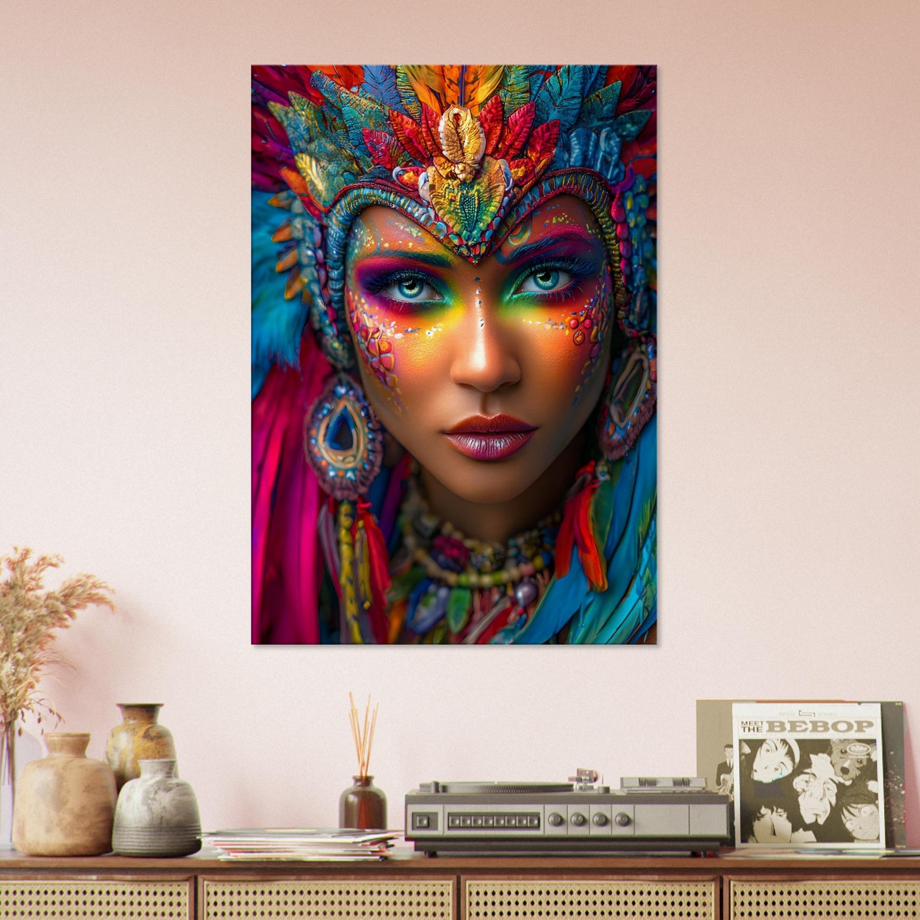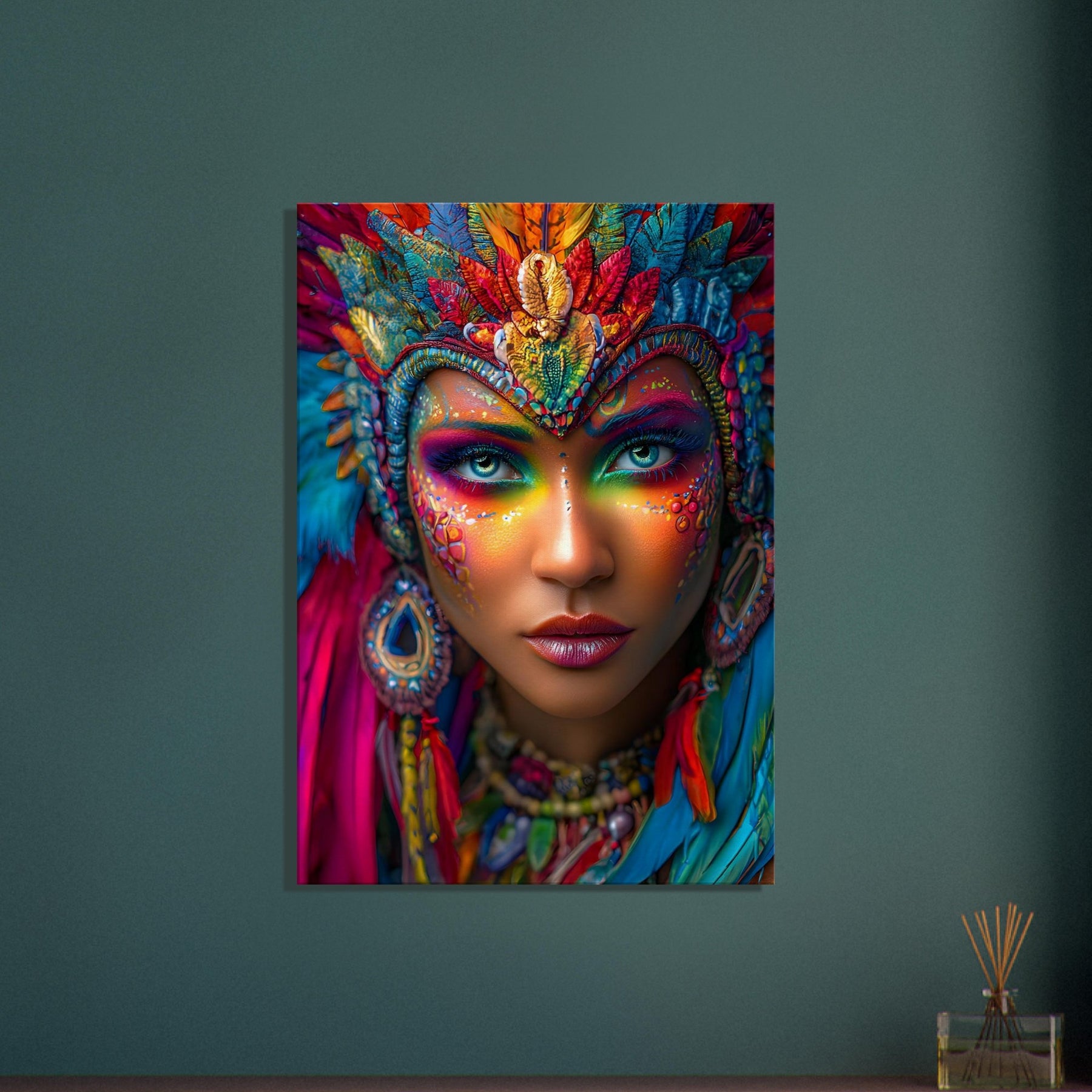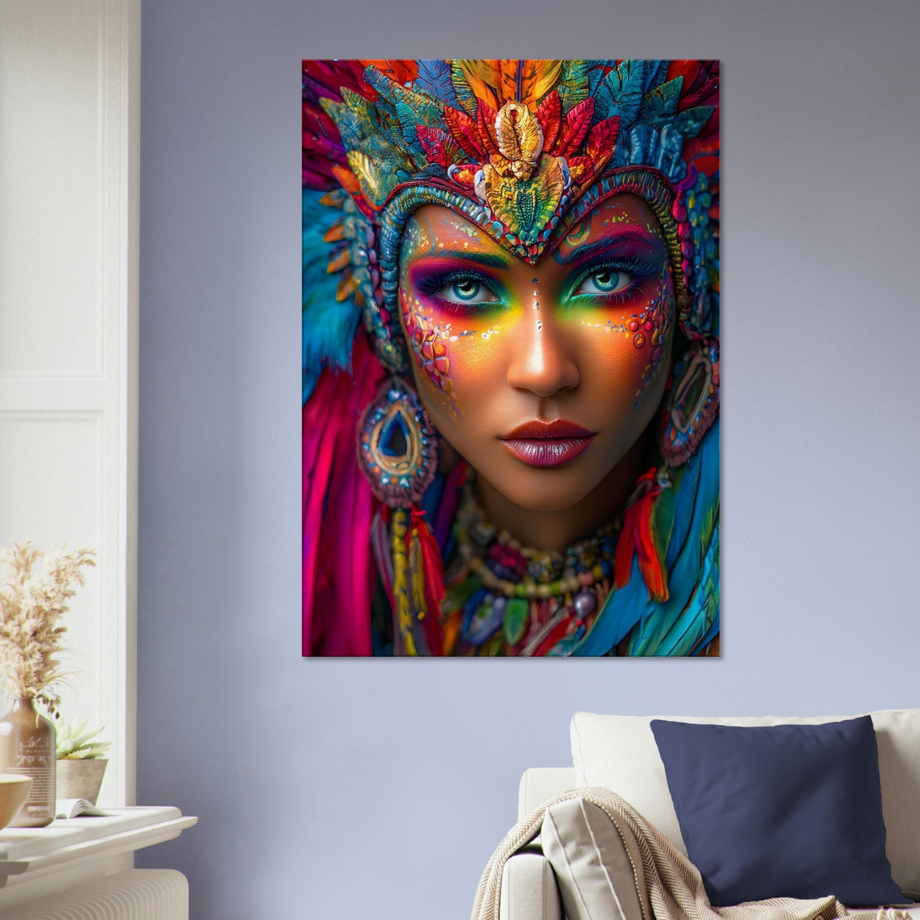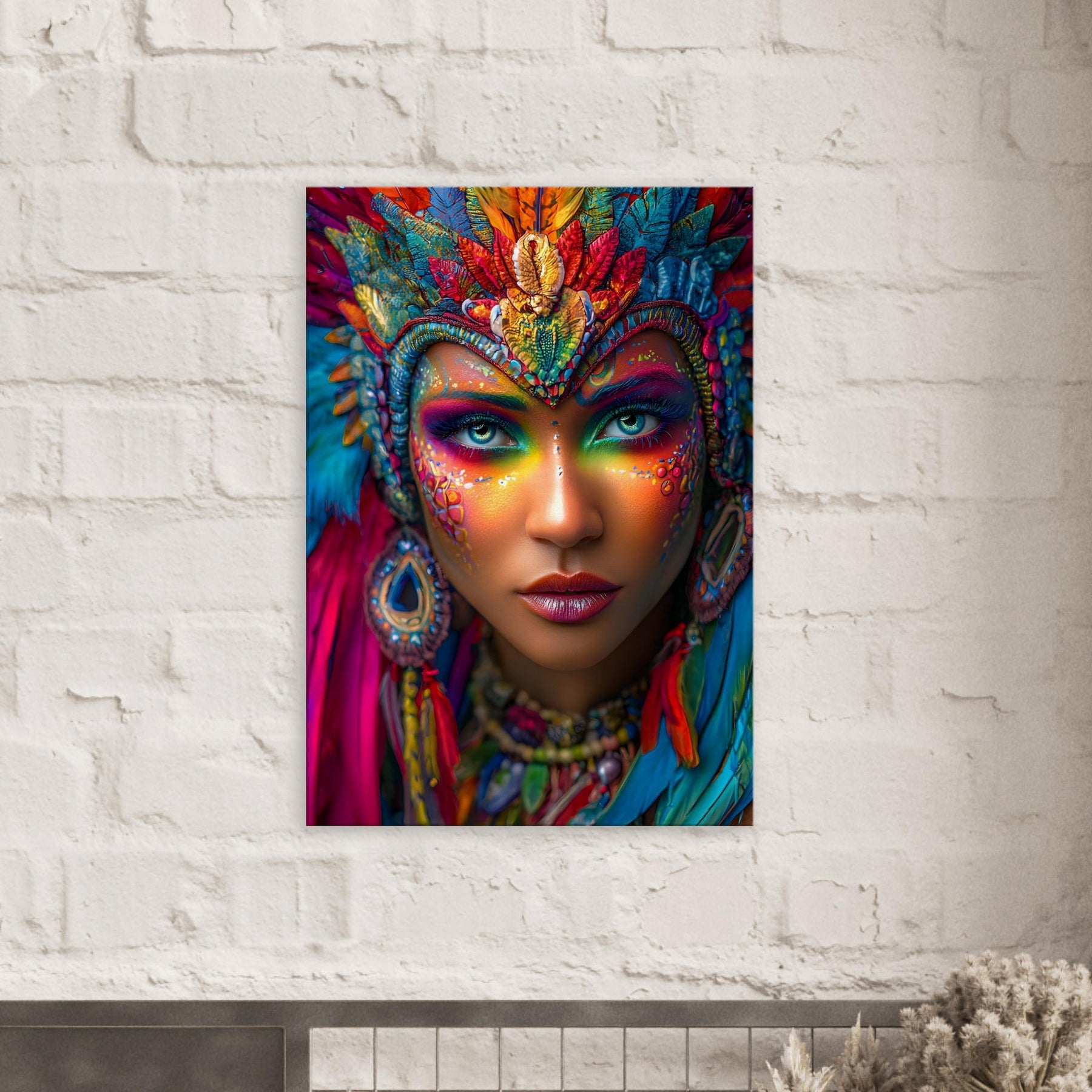 Transform your space with Carnival Spirit Muse, a striking canvas wall art piece that captures the energy and beauty of celebration. A powerful portrait of a woman adorned with vibrant carnival face art—colorful makeup, sparkling jewels, and flowing feathers—reflects joy, creativity, and festive spirit.