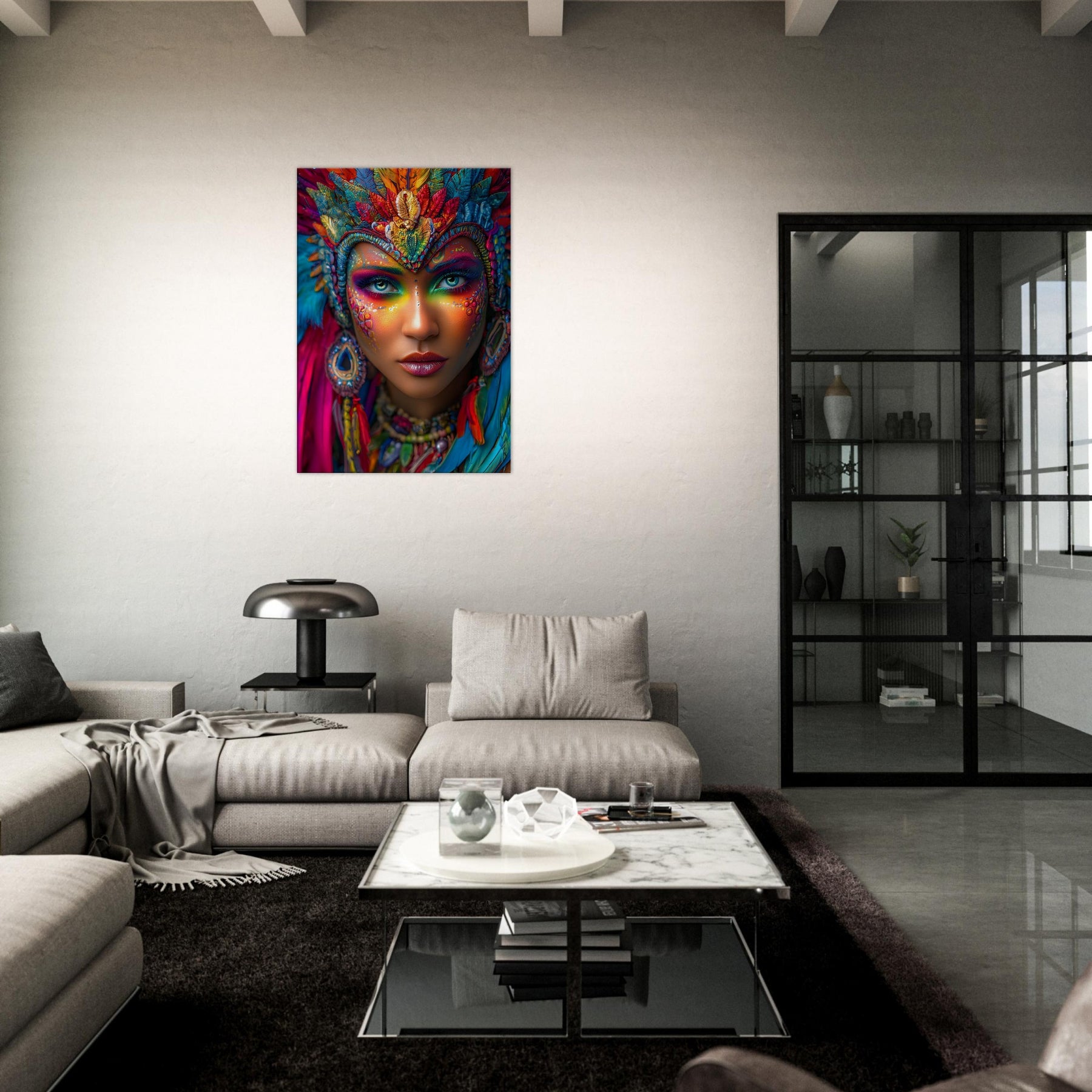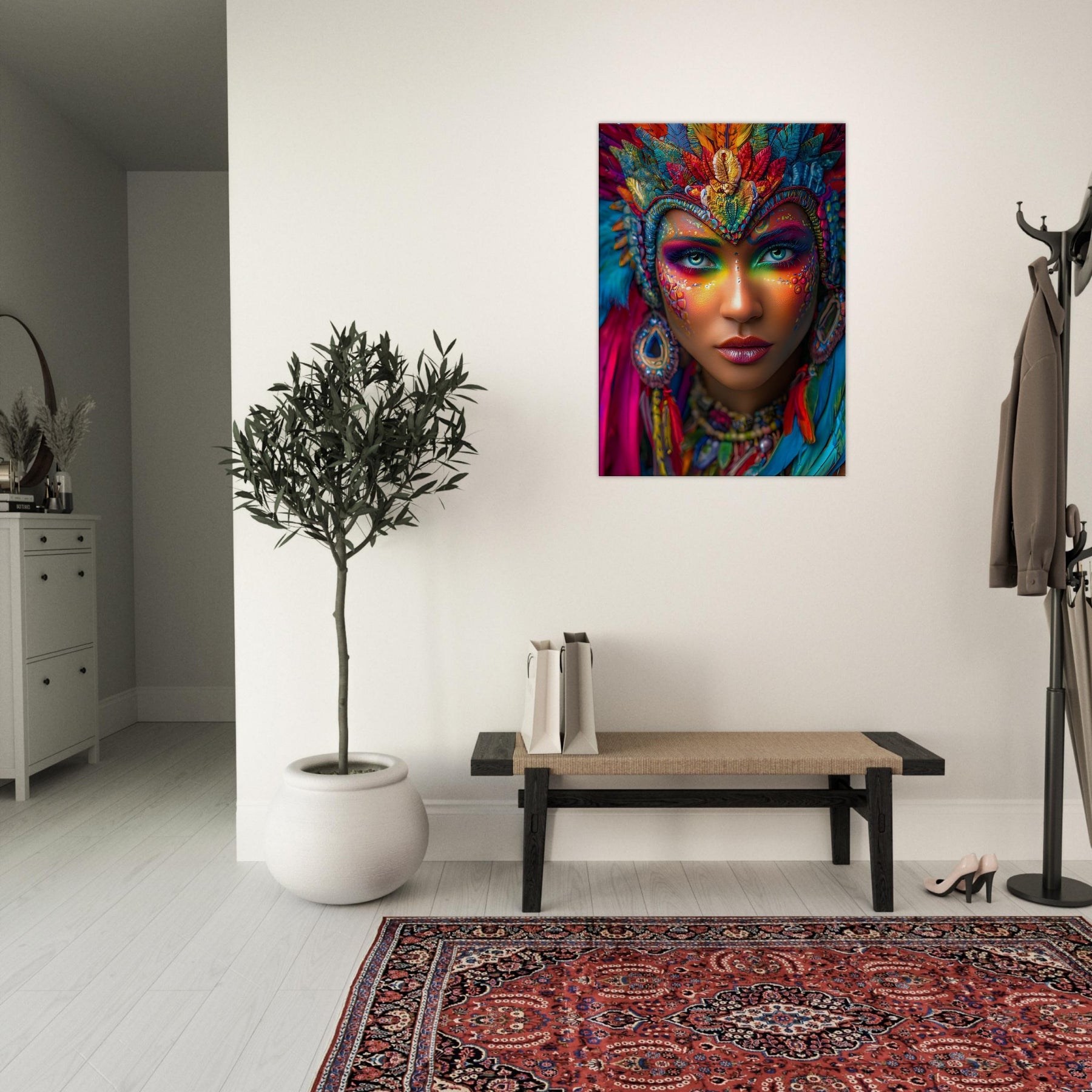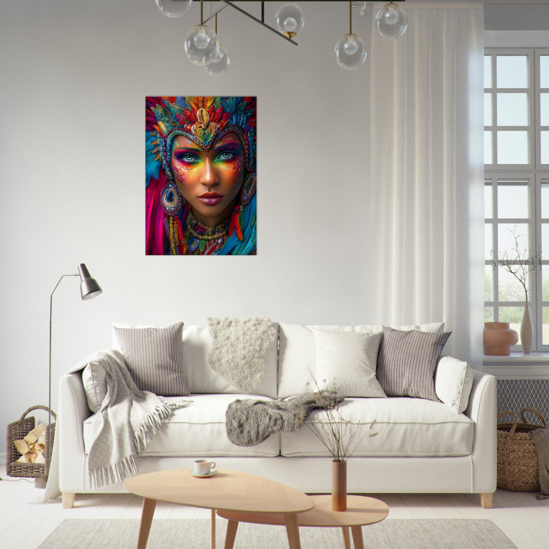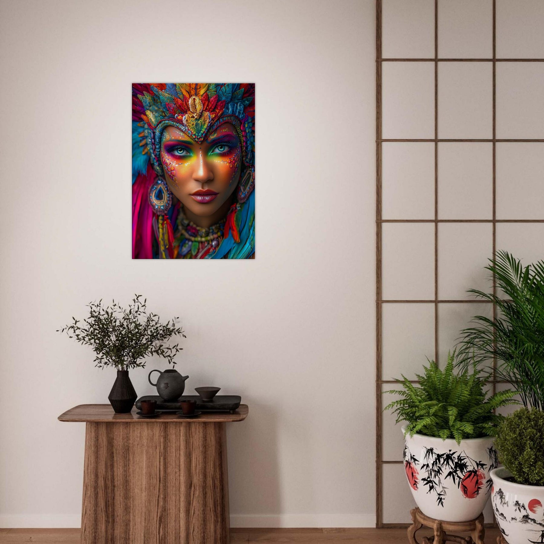 Transform your space with Carnival Spirit Muse, a striking canvas wall art piece that captures the energy and beauty of celebration. A powerful portrait of a woman adorned with vibrant carnival face art—colorful makeup, sparkling jewels, and flowing feathers—reflects joy, creativity, and festive spirit.